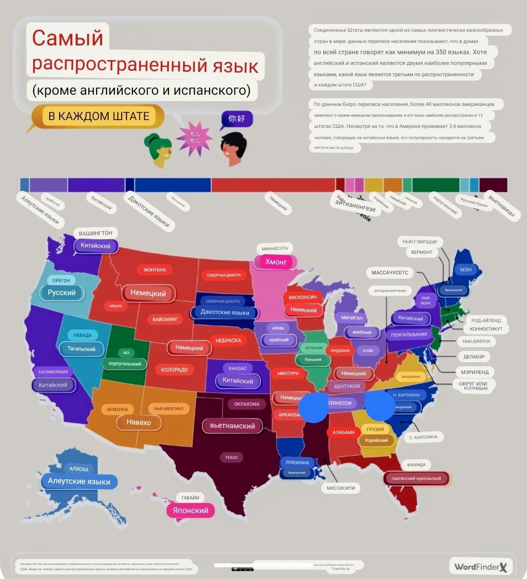 В то время как 78% американцев дома говорят только по-английски, в Соединенных Штатах можно найти от 350 до 430 языков.Испанский - второй по распространенности язык, на котором говорят в 62% семей, не говорящих по-английски.На этом рисунке WordFinderX использовал данные переписи населения, чтобы выявить наиболее распространенные языки (помимо английского и испанского) в американских кварталах.