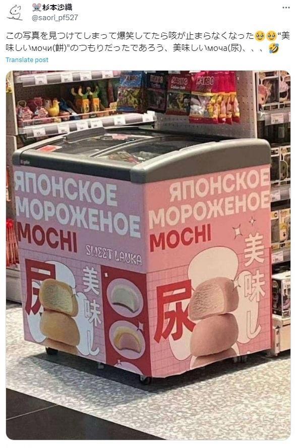 「美味しいмочи(餅)」のつもりだったであろう、美味しいмоча(尿)