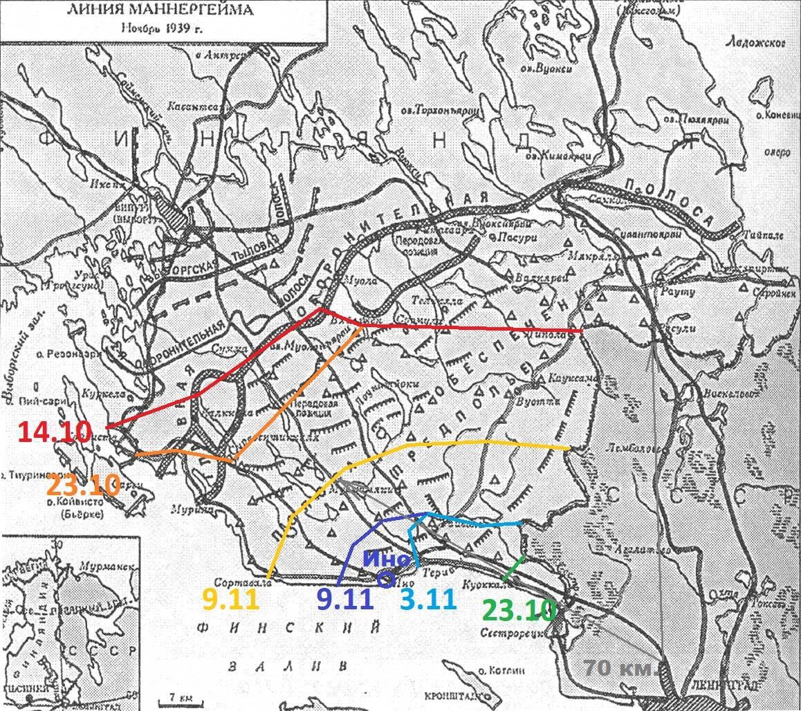 Финской стороне на переговорах в Москве правительство разрешило уступить еще и форт Ино с 8 километрами предполья, если советская сторона откажется от своих требований по базе в Ханко. Хотя президент Финляндии Каллио твердо высказался против уступки Ино. Свою позицию президент аргументировал тем, что русские потребуют еще и прилегающую территорию, которая будет защитным поясом для Ино. Так оно и вышло, Сталин попросил 20 километров предполья.