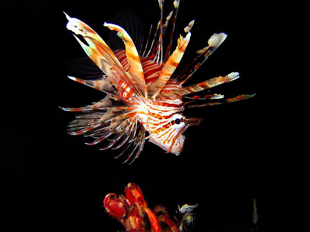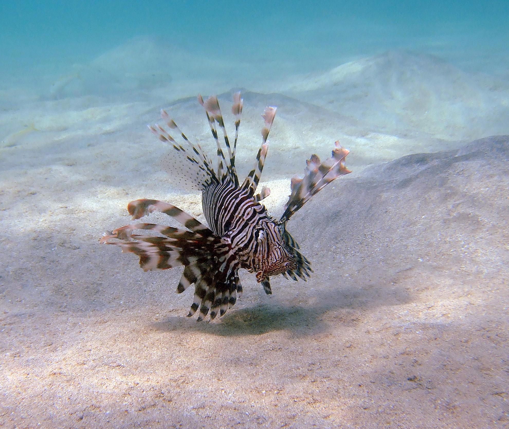 Крылатка-зебра. Довольно ядовита. Руками не трогать