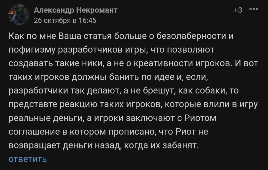 Если разрабы начнут банить еще и за ники, в которых нет прямых оскорблений или бан вордов, ну или просто за то, что нашелся человек, который не оценил ник "писькагрыз", то все, тушите свет. Мы официально в черном зеркале и большой брат следит за нами.