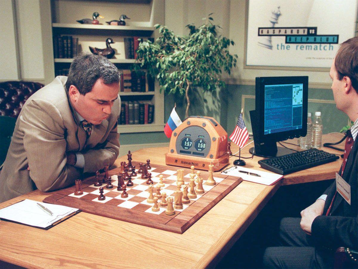 В 1996 году гений шахмат Гарри Каспаров обходит робота Deep Blue, почти играючи забирает победу со счётом 4 : 2. Сотрудники IBM всё проанализировали, потратили год и улучшили собственное творение. 11 мая 1997 года старые противники снова встретились за столом. Deep blue побеждает со счетом 3 : 2 (одна партия пат).
