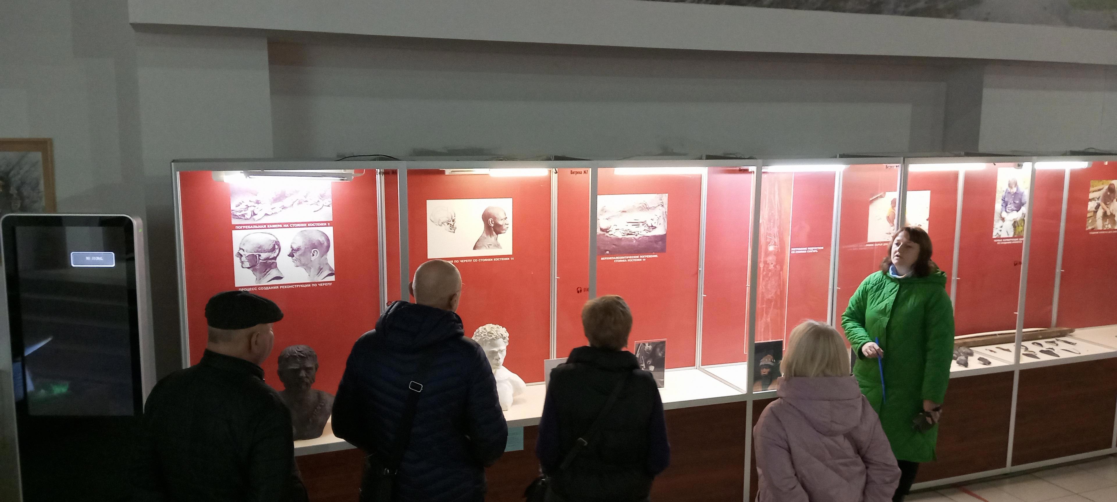 Еще в экспозиции показывают две головы первобытных людей (реконструкции, конечно, и рисунки, в каких позах они были похоронены), которые были найдены в Костенках, и пришли сюда в разные периоды времени. Как рассказала экскурсовод, «они не могли встречаться друг с другом, потому что между ними лежат тысячелетия», но, согласно исследованным ДНК, их потомки сейчас живут в Европе, то есть они предки европейцев.