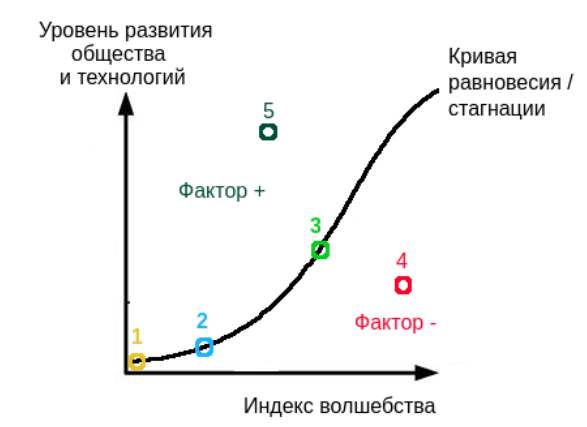 В таком случае мы получим довольно простой, но в то же время интересный график "кривой равновесия" - линии, характеризующей адекватный баланс между общественным строем, наукой, техникой и возможностями магии.
