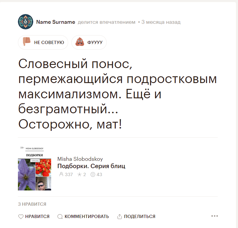Автор: Misha SlobodskoyУдивительно после публикации в одном электронном издательстве прошло два года. И тут на те здрасте пришло пару тысяч рублей. Приятно вот только почему две и как это проверить? А с другой стороны , да всё равно надо проверить. Ведь сказал же президент "не верить ни кому"! Смех и грех. Начал проверку посмотрел отзывы, все противоречивые. Кто хвалит например Литрес, кто наоборот. Так где же рейтинг издательств? А как у вас с этим , ну с этим доверием!?