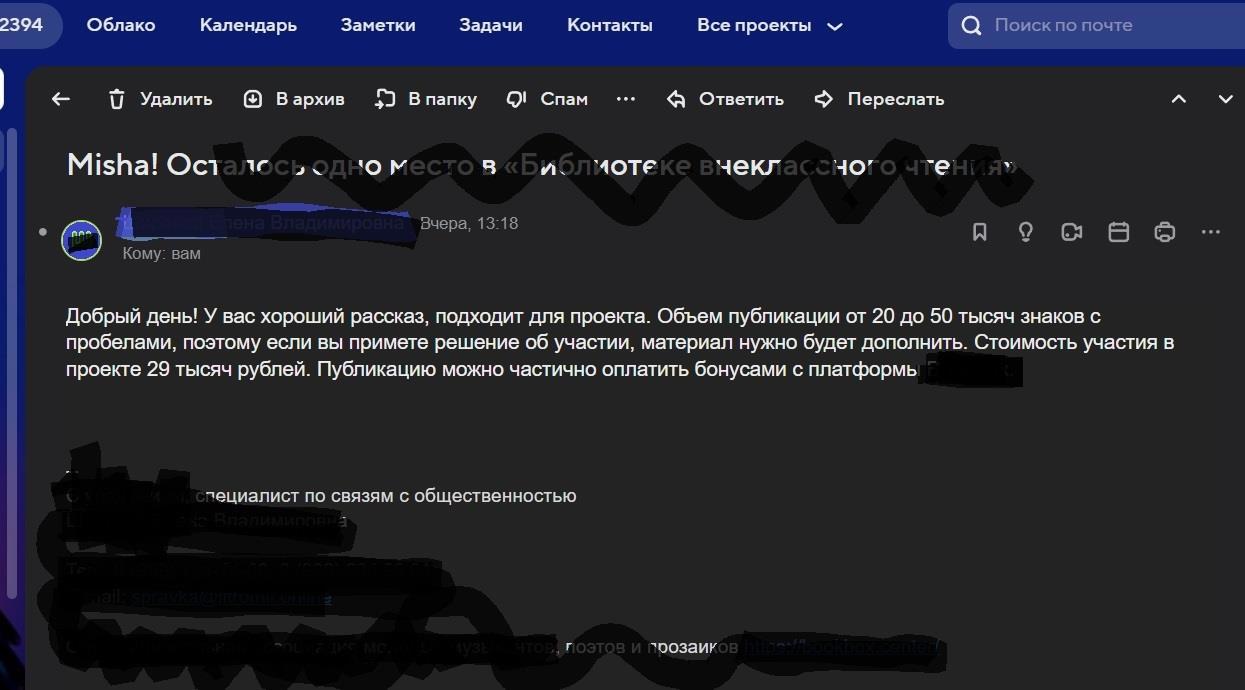 Автор: Misha SlobodskoyСтали приходить письмо с предложениями опубликовать рассказ в сборнике, причем от разных издательств. Всё бесплатно как всегда, есть два места, надо срочно... Выбирайте , присылайте , будет конкурс и т.д. и т.п. Недолго думая отправил им рассказик. Получил ответ ниже и смеялся минут десять...Лихо закрутили...