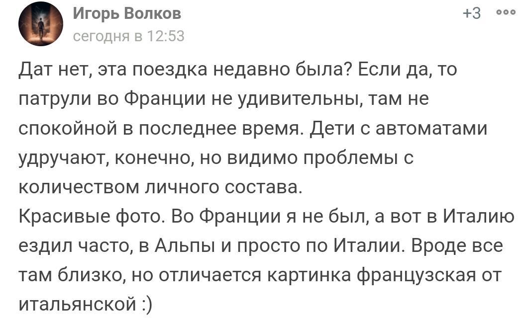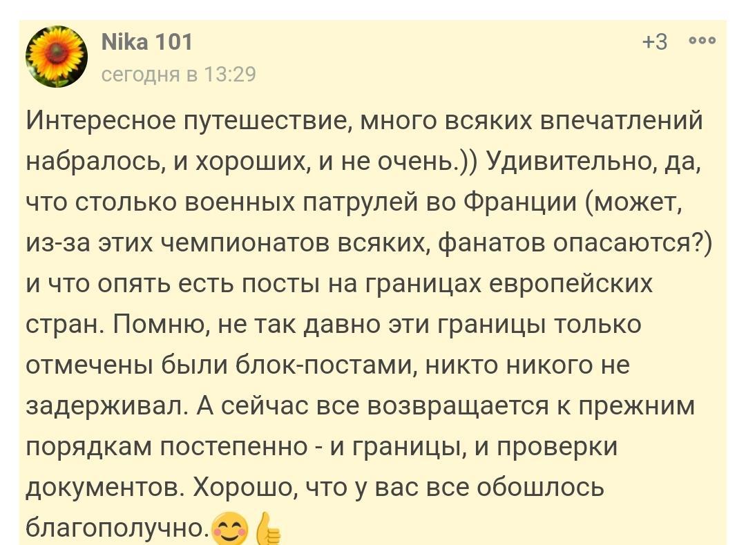 N.B. Хотел бы в двух словах рассказать про то, что именно во Франции мы увидели много вооружённых военных патрулей. Именно серьёзно вооружённых. Не просто пистолеты, вполне себе тяжелое (для пехоты) вооружение. И ходили они как минимум тройками, а чаще всего побольше. С одной стороны спокойнее, но с другой стороны, наоборот тревожнее. В состаые этих патрулях я видел совсем молоденьких парнишек и девчонок. Это меня несколько удивила. Девочка, чуть ли не школьница, со штурмовой винтовой? Это ведь не отечественная война все же. Не знаю. ЛОЛ.