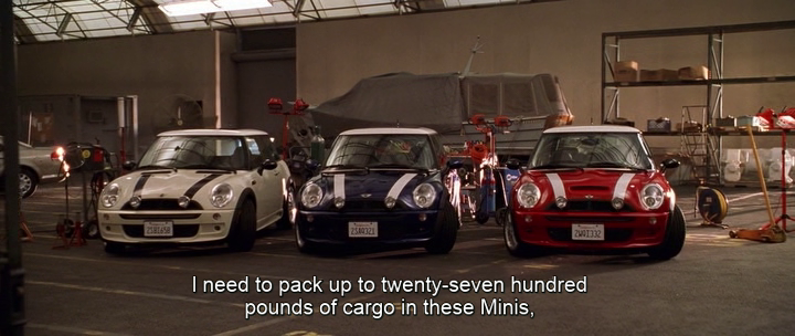 Главные автомобильные роли в нём несомненно принадлежат трём разноцветным "МИНИ-Куперам", на которых в фильме исполнено множество трюков: