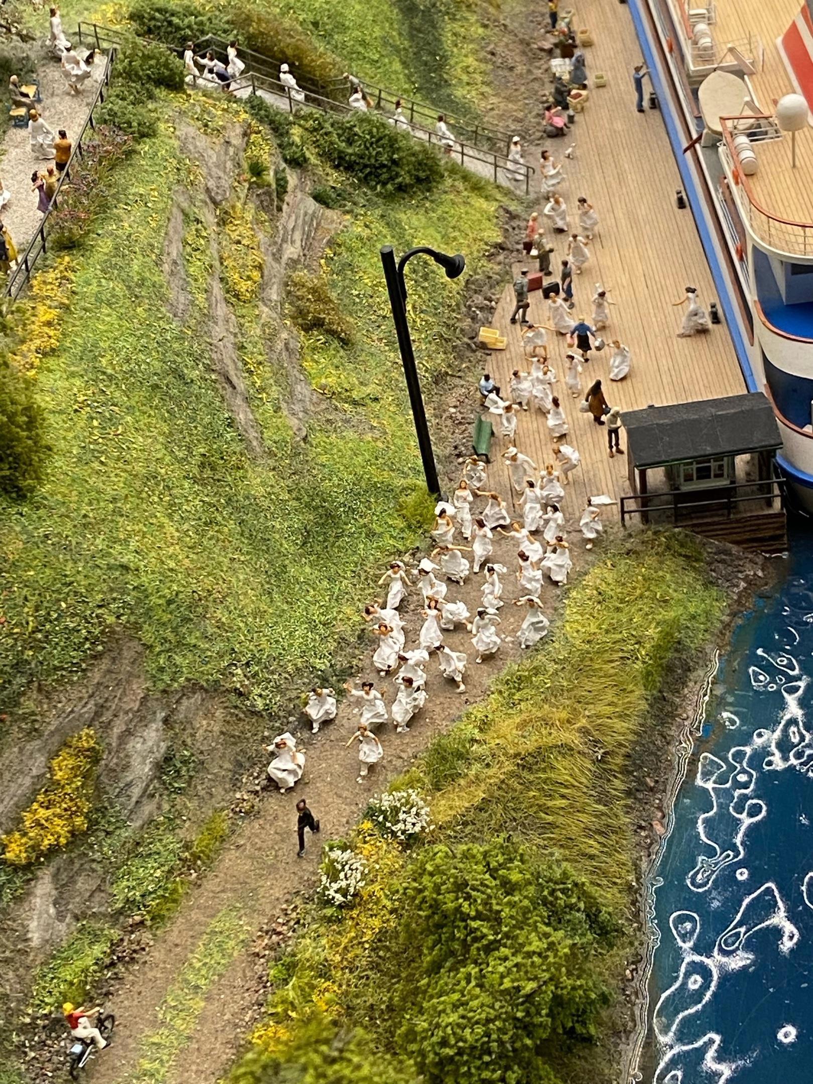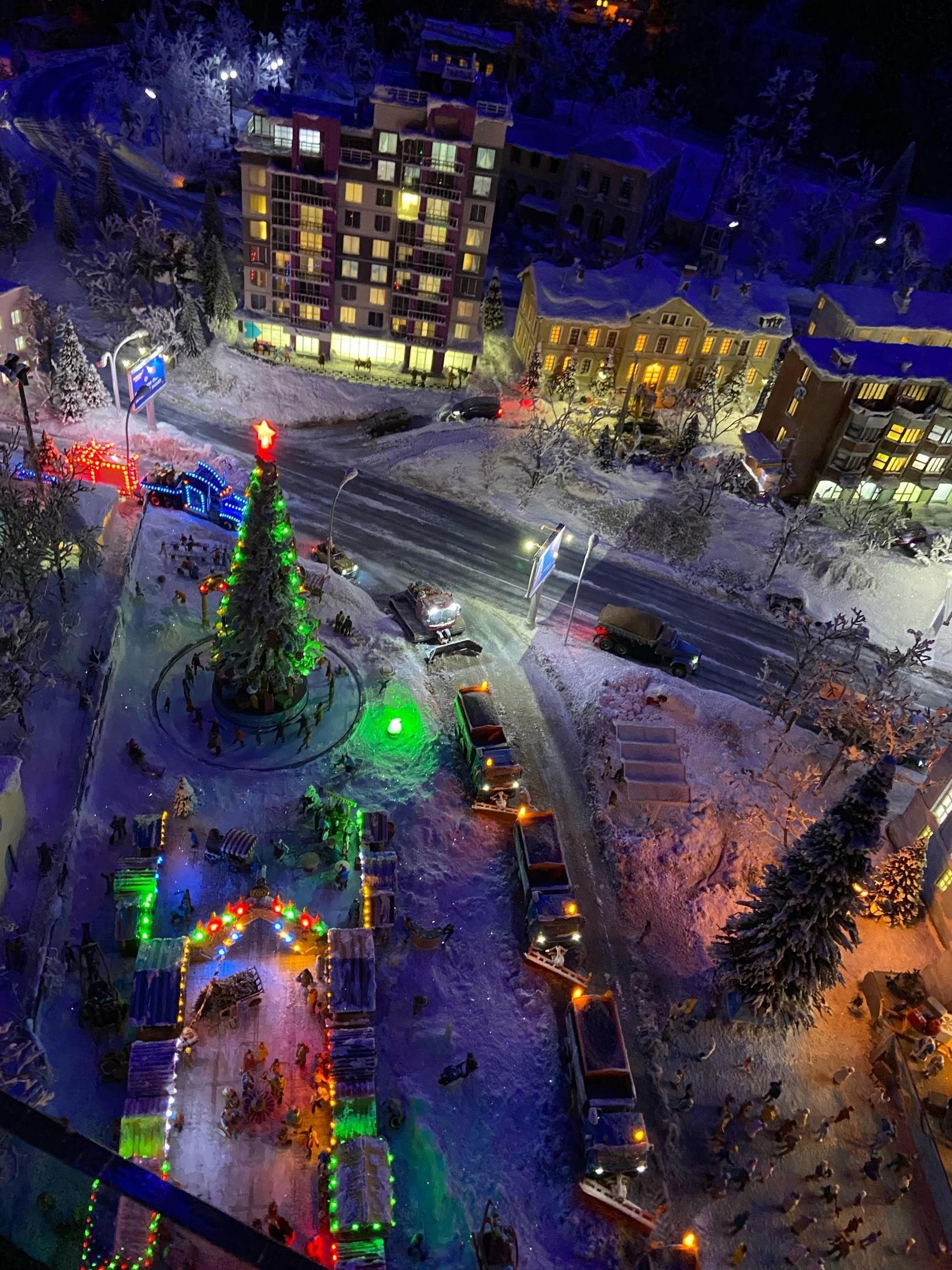 Кто не знает, поясню: макет сделан в масштабе примерно 1:87 (на деле масштаб "плавает" от 1:72 до 1:100 - я это отлично вижу по знакомым моделям) и оснащен сменой дня и ночи и уймой интерактивных сцен (включая извержение вулкана - оно как раз по ночам). Постоянно в движении поезда и автомобили.