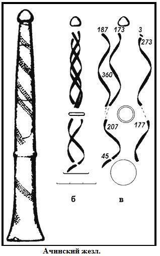 Для просветления могу добавить ещё парочку предметов, которые хорошо демонстрируют высокий уровень развития наших далёких предков. Вот на этой картинке изображён так называемый «Ачинский жезл»: