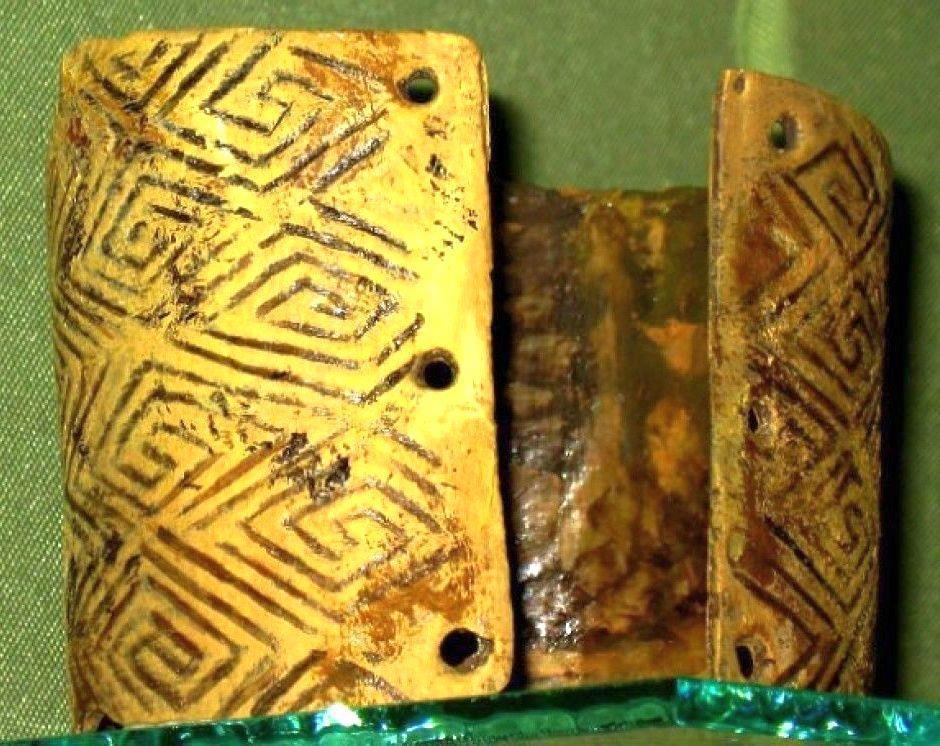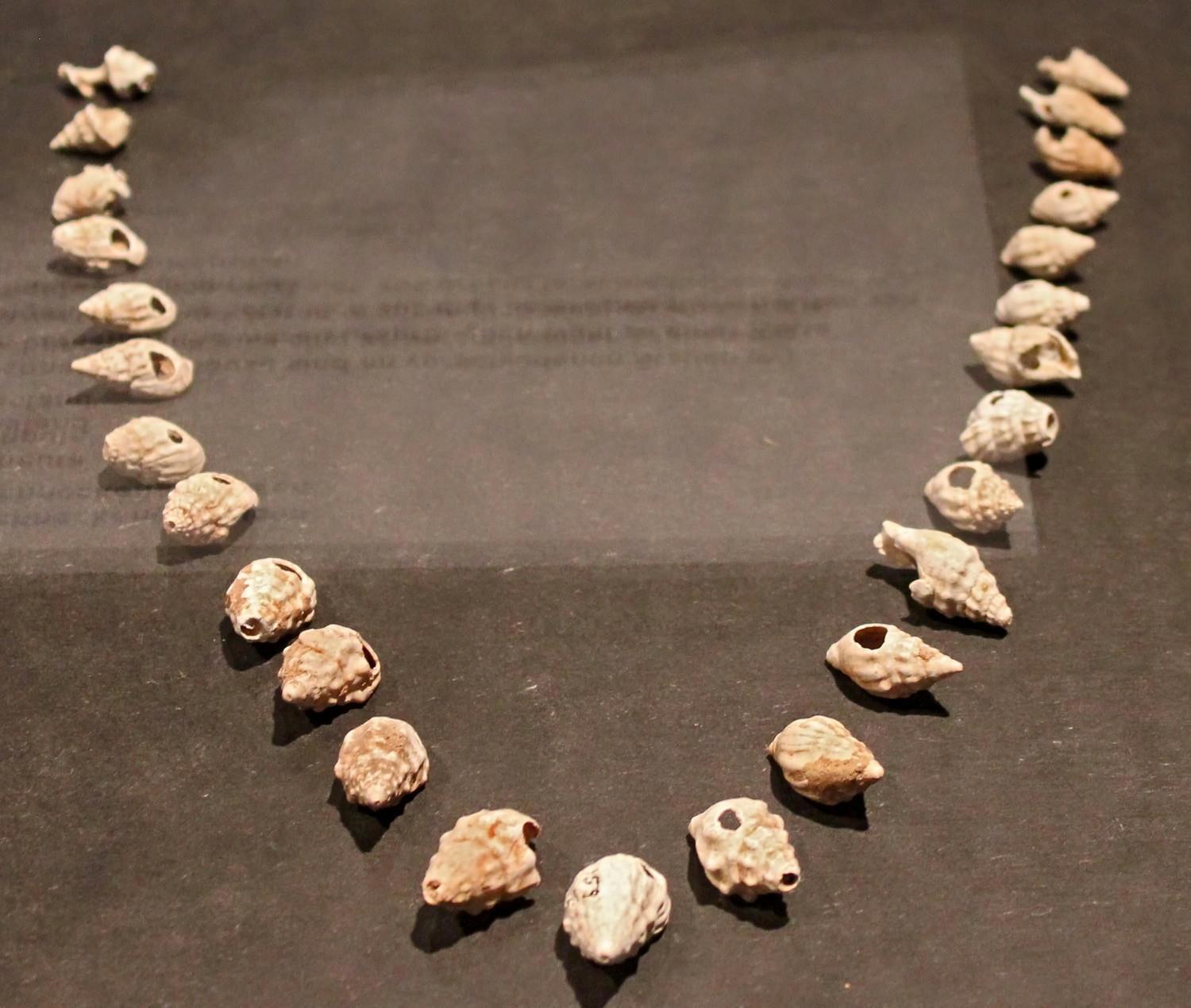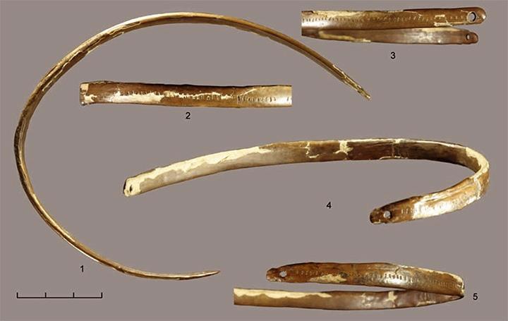 Хрупкие ракушки, которые как-то просверлили не повредив, и нанизали на нитку, которую сделали неизвестно как. Но ещё раньше эти самые ракушки нужно было где-то взять… это морские раковины, а под Черниговым моря нет вообще-то. Кости мамонтов были. Вот такие браслеты с «меандровым узором» из них делали: