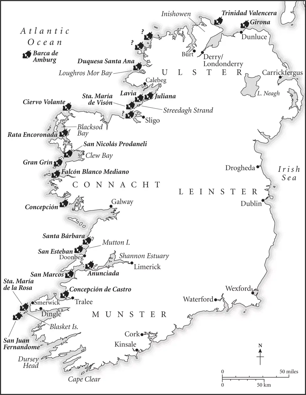 Карта мест гибели кораблей Армады в Ирландии