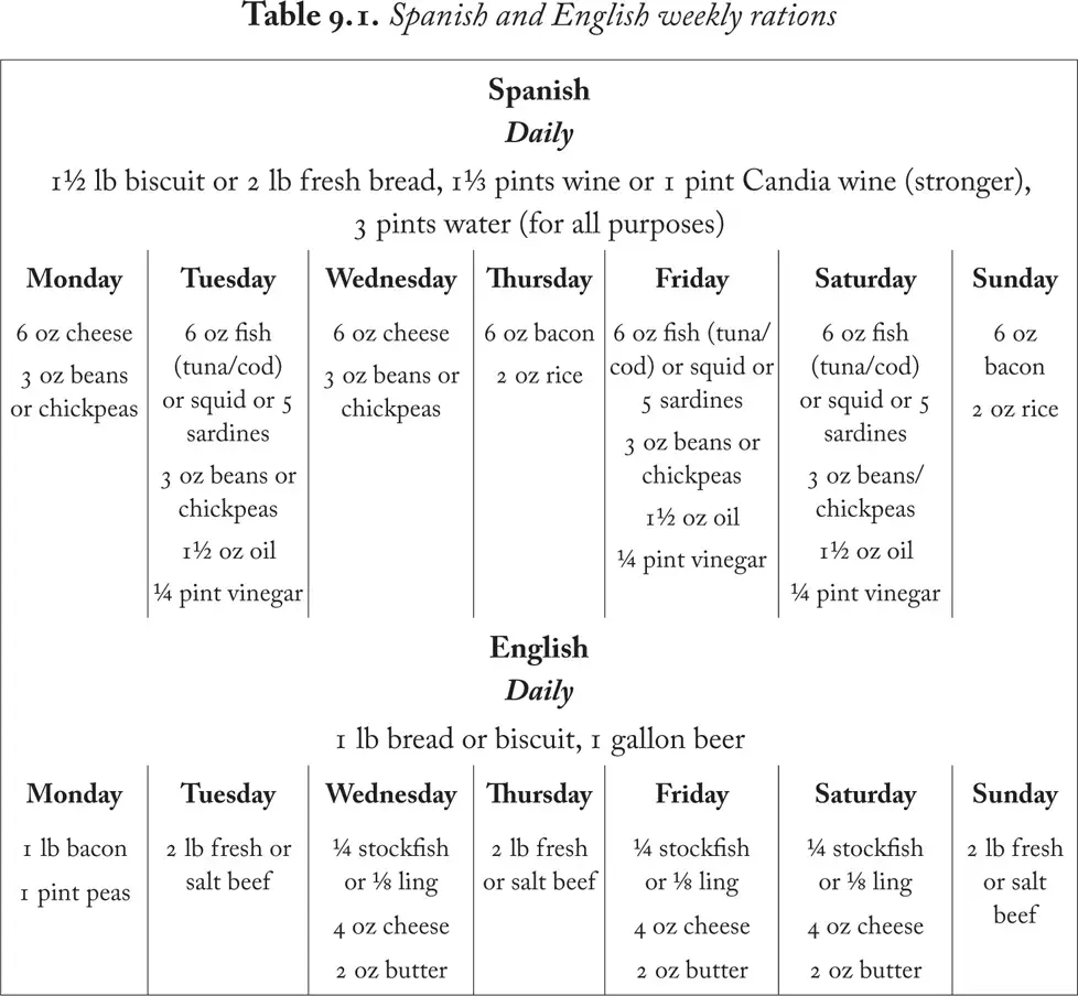 Меню испанских и английских моряков