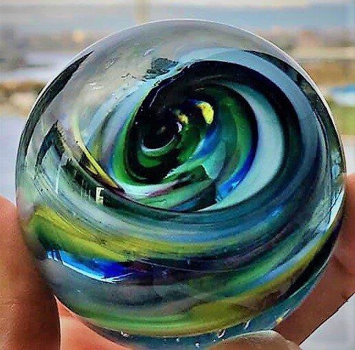 Прямо напротив находился стеклянный шар, примерно с мой кулак размером. Я уставилась на него. Гладкий и прозрачный, голубого цвета, с разводами желтого, зеленого, белого и фиолетового цветов. Внутри закручена разноцветная спираль и просматриваются пузырьки воздуха. Я подержала шар в руках, тяжелый. Посмотрела на просвет, маленький торнадо, заключенный в шаре переливался по-неземному и шар становился настоящим сказочным предметом.