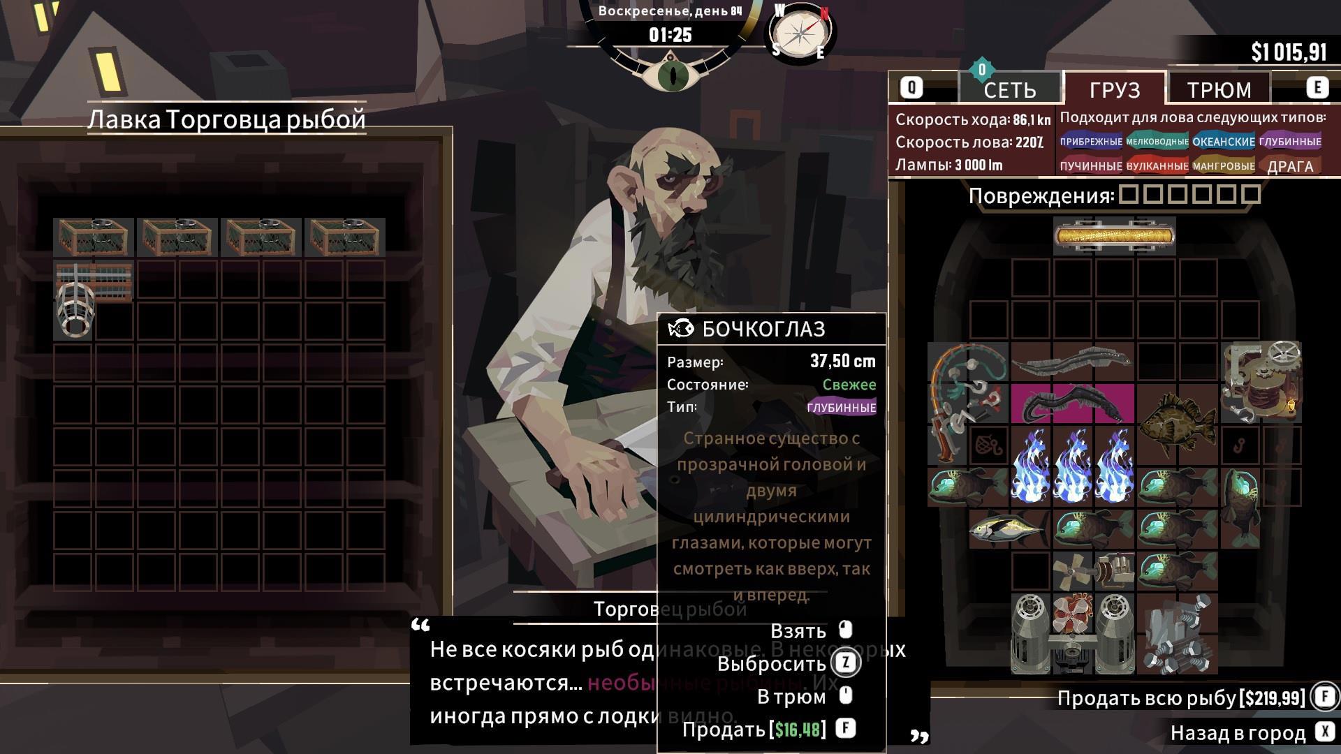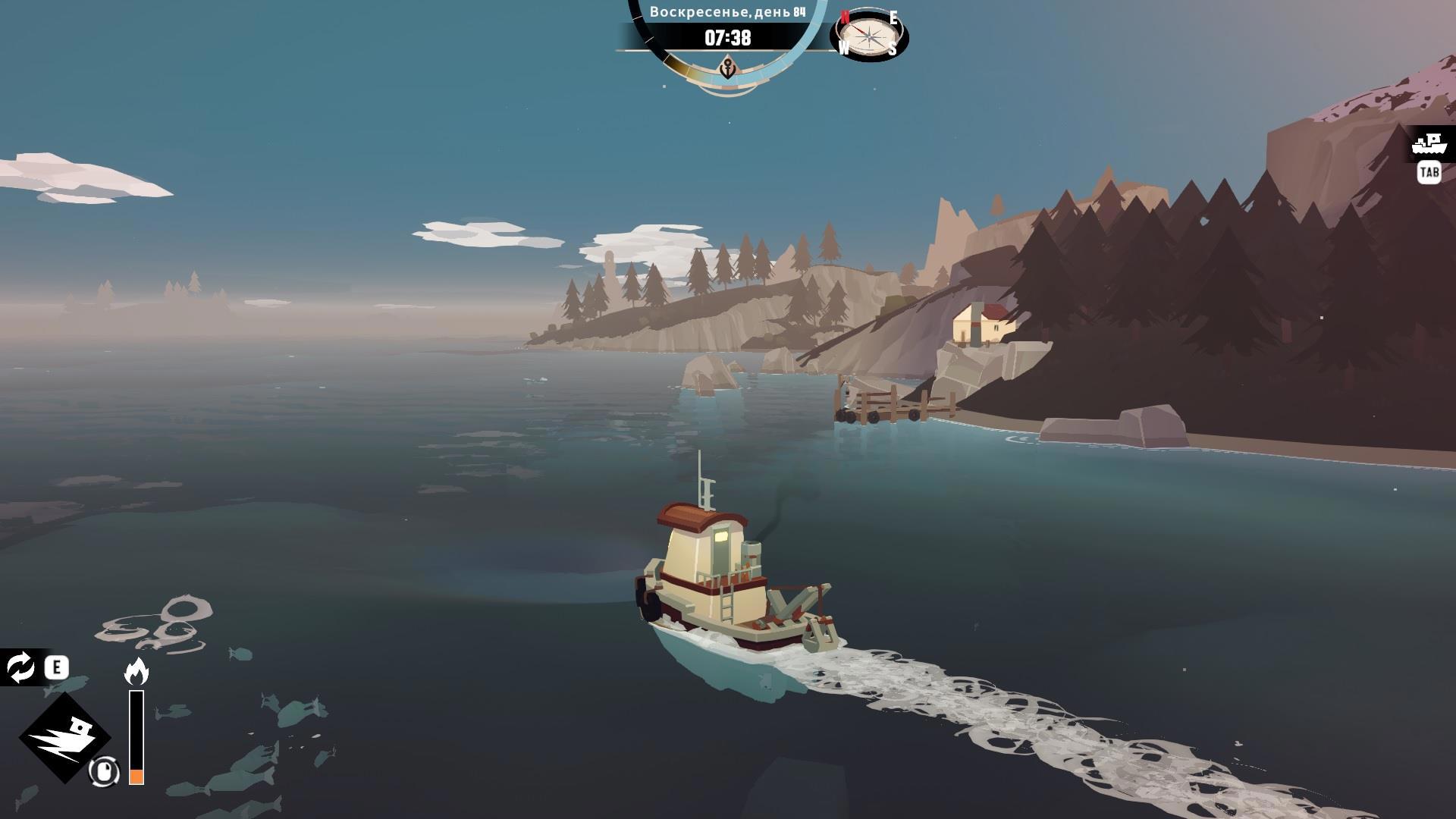 А потому игру можно описать так: выходим в море, ловим рыбу, возвращаемся в населённый пункт или к торговке на её плавучую платформу, продаём улов, латаем лодку, улучшаем лодку (если есть на что и чем), изучаем новые технологии, покупаем новые приблуды (если нужны, и если есть на что), спим, повторяем.