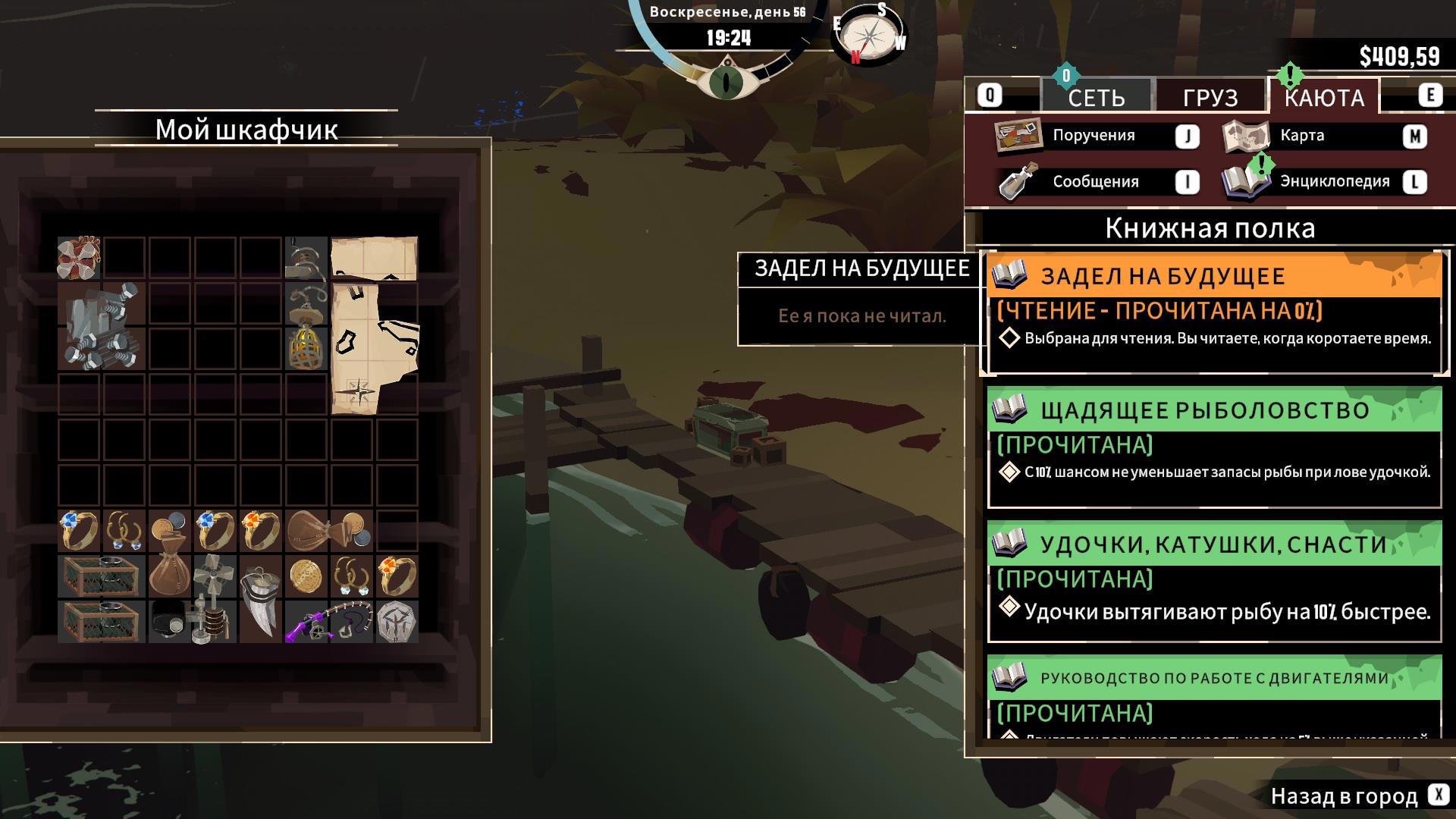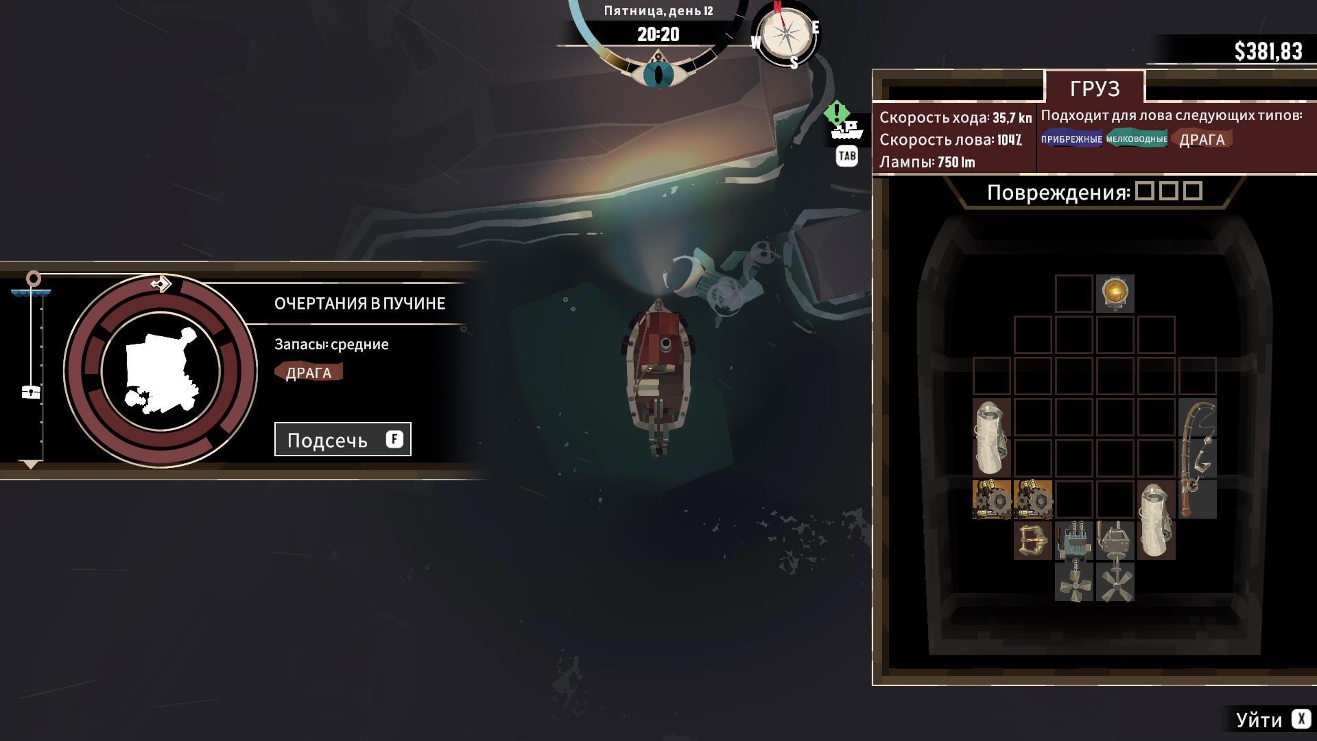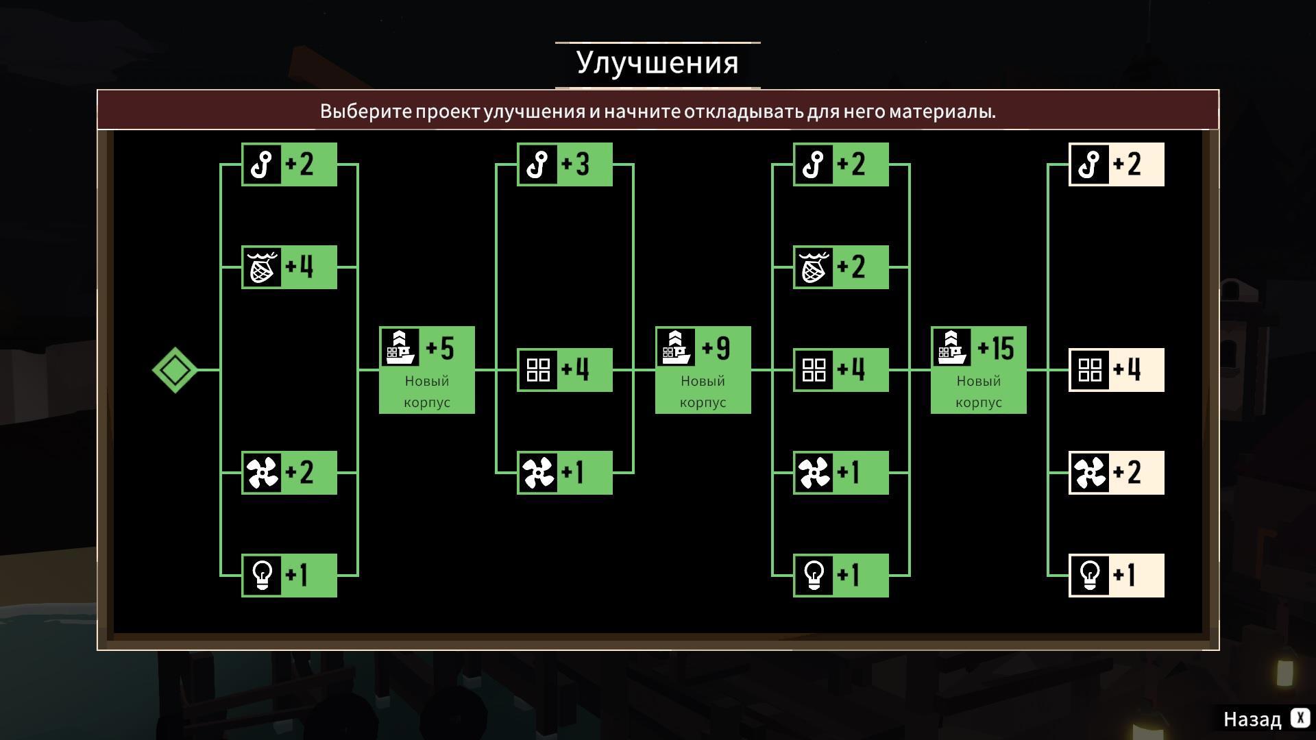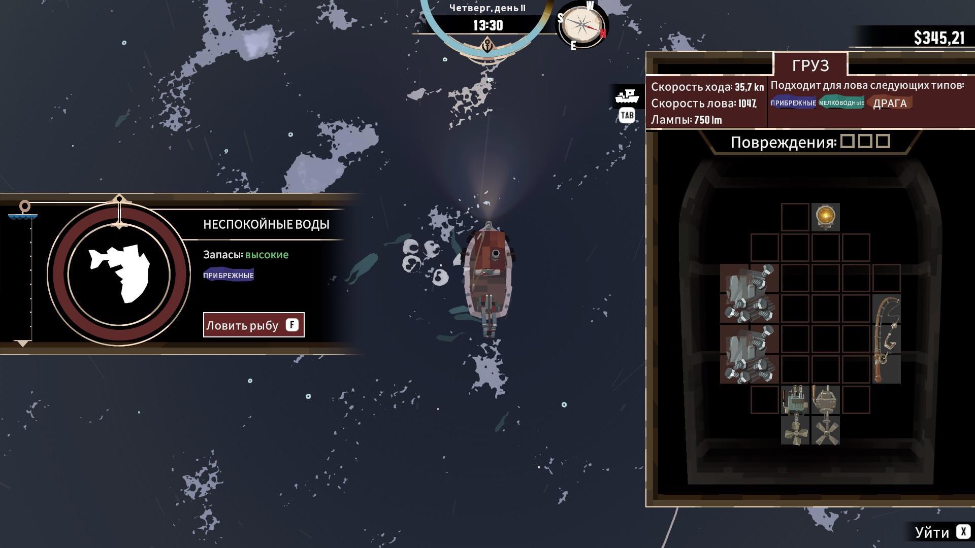 Более того, место на кораблике не бесконечно. Нужно сперва разместить обязательные узлы (для каждого из них есть некоторое количество слотов, число которых растёт вместе с улучшением судна), после – все дополнительные, какие игрок считает нужными, но если напихать вообще всего, то мало места останется для улова.