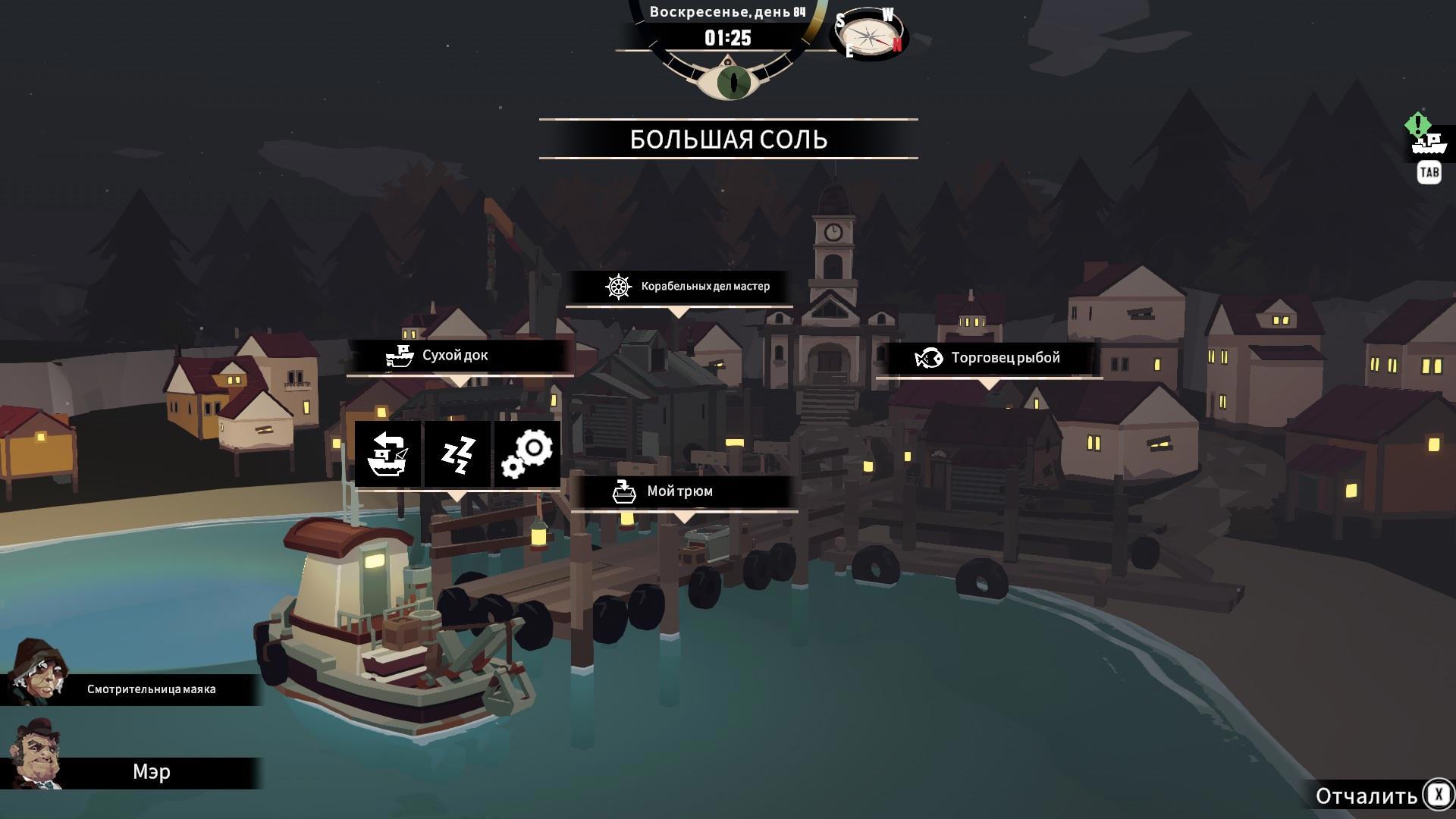К счастью, остров обитаем и мэр городка, в котором мы нашлись, предлагает работу. Ну а что, острову нужен рыбак. Так что: «ноунэйм, я с тобой в благородство играть не буду, вот старая лодочка в зубы и вперёд, лови рыбу, а мы будем покупать её по честной рыночной цене. Как отобьешь лодку, она полностью твоя, делай дальше, что хочешь».