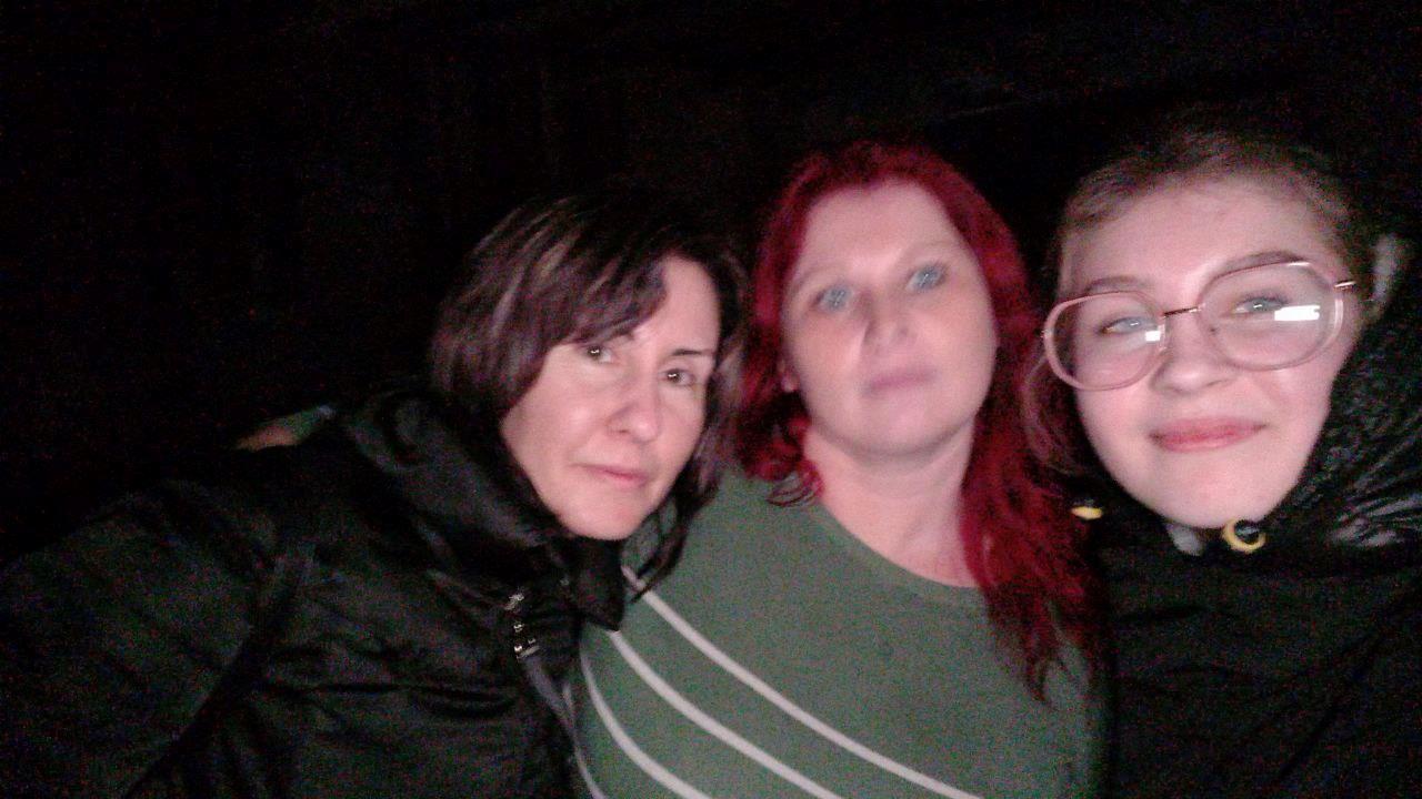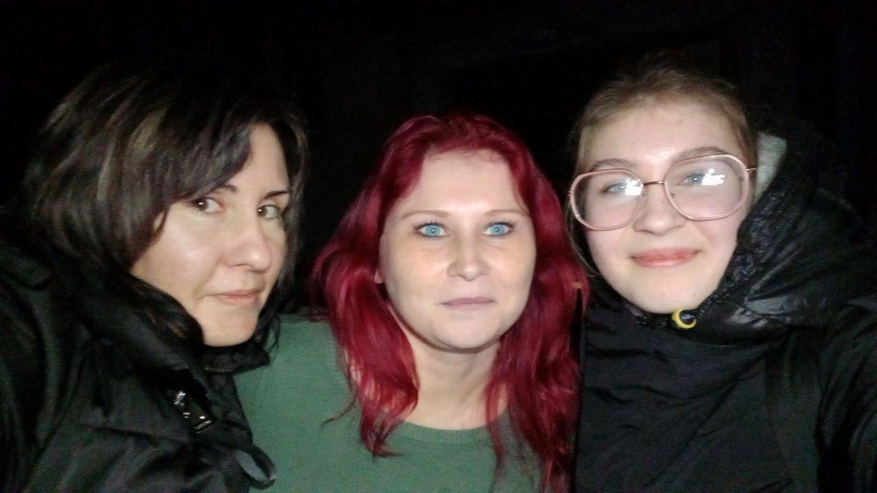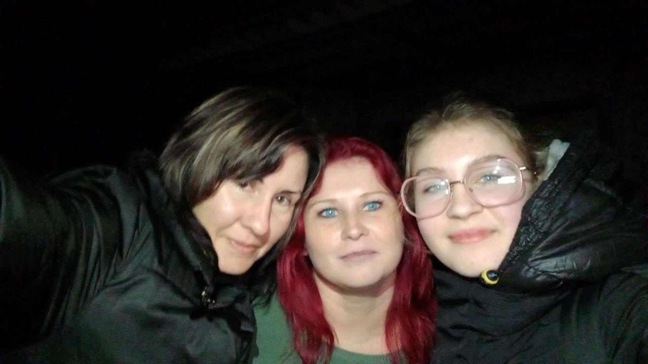 Короче, мы нагребли всего, что понравилось, набили чемоданы и снова закрыли квартиру. Оля раздала интернет и мне начала написывать подруга, что давно ждёт нас в гости. Вышли уже затемно. Вспомнили, что хотели совместное фото, пришлось делать селфи у подъезда, где не горит свет. Это было нечто! Фоткаться в темноте -- то ещё удовольствие: то все глядят в разные стороны, то фото засветилось, то вообще сфоткали темноту!
