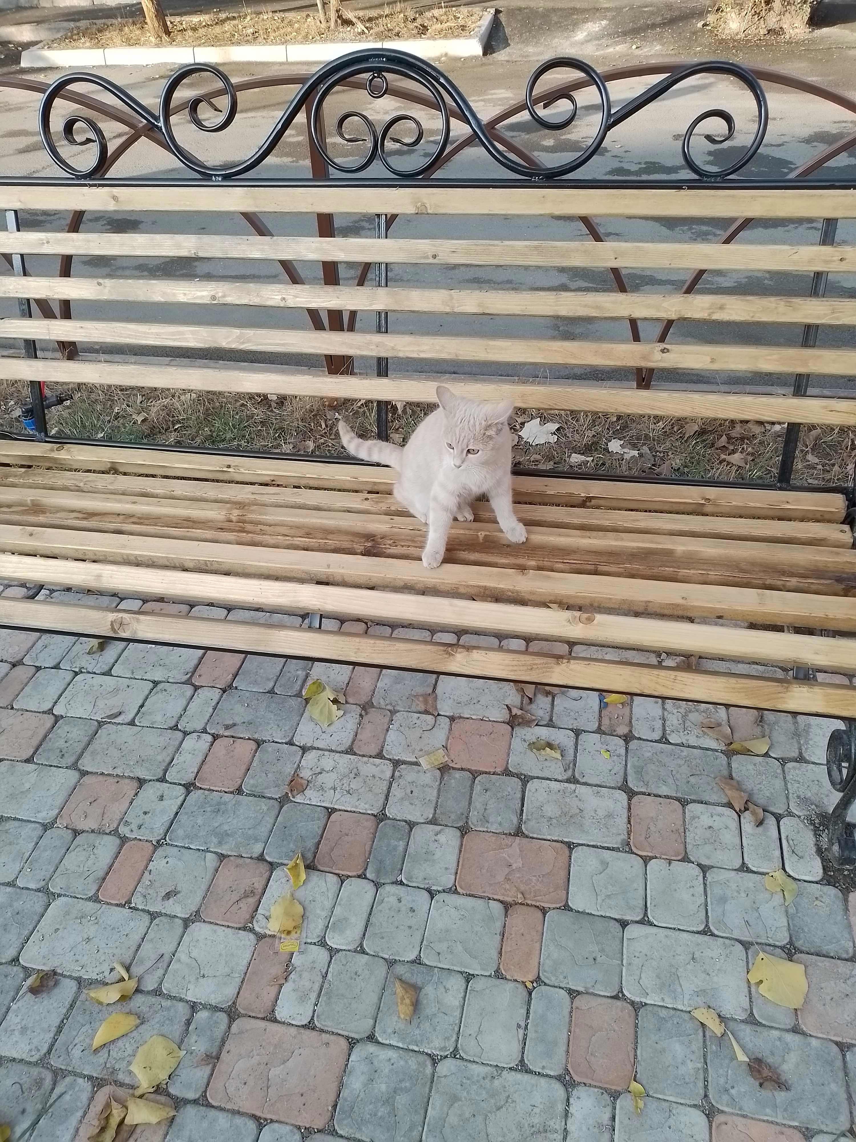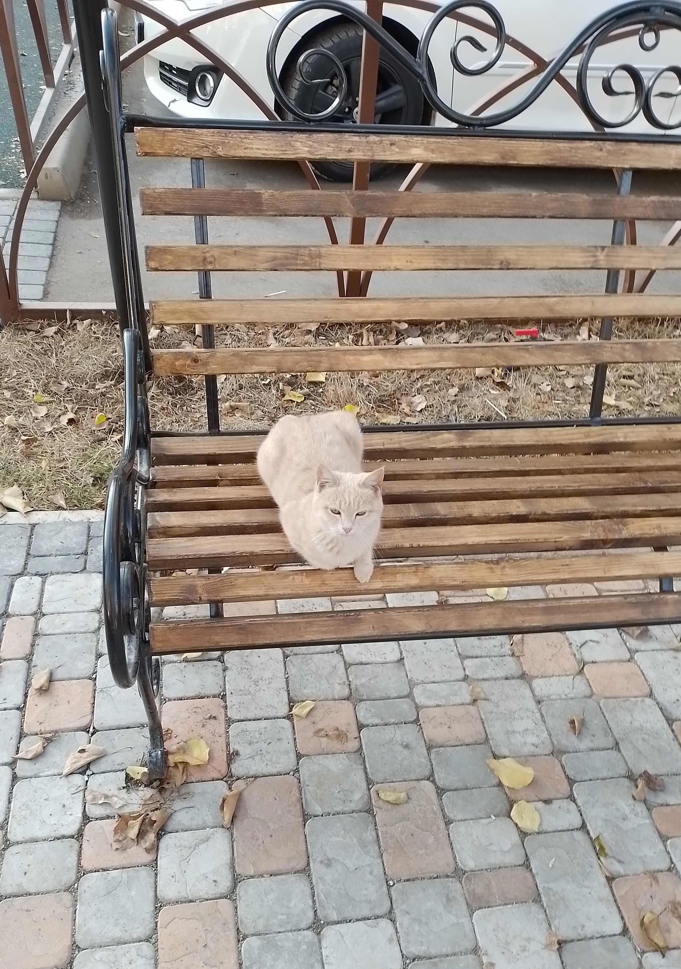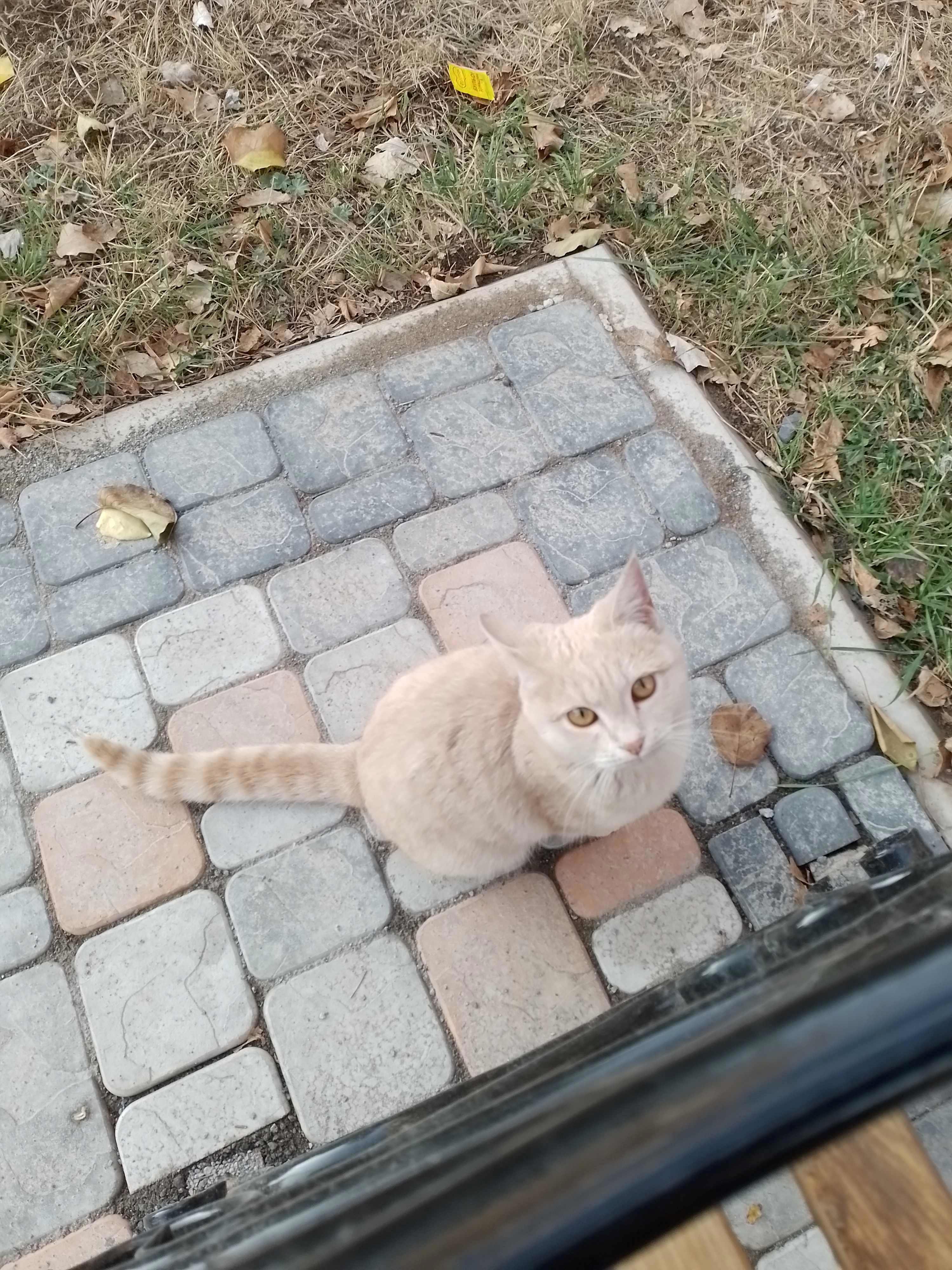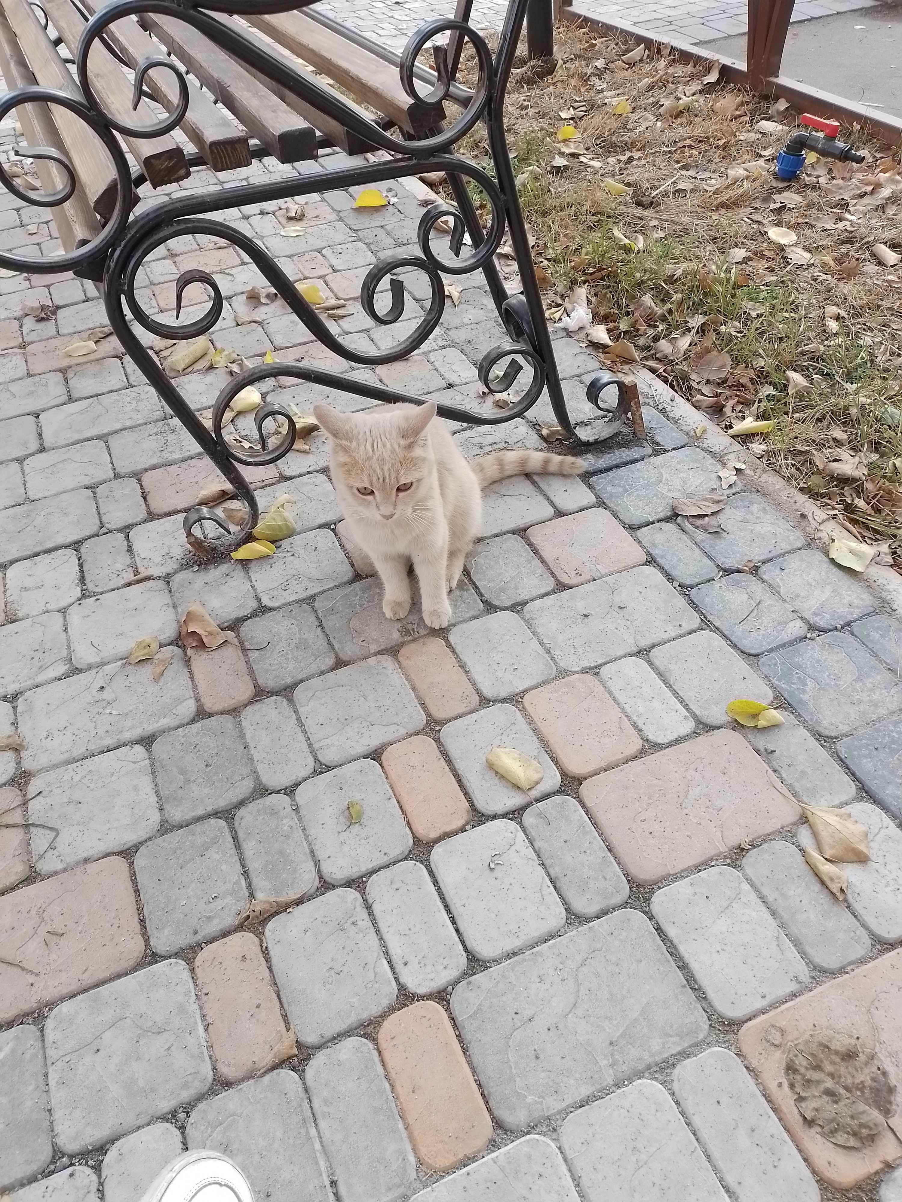 Это наш дворовый Персик, а коротко Перс. Он очень славный и почти ручной. Прыгает на колени и даёт себя погладить.