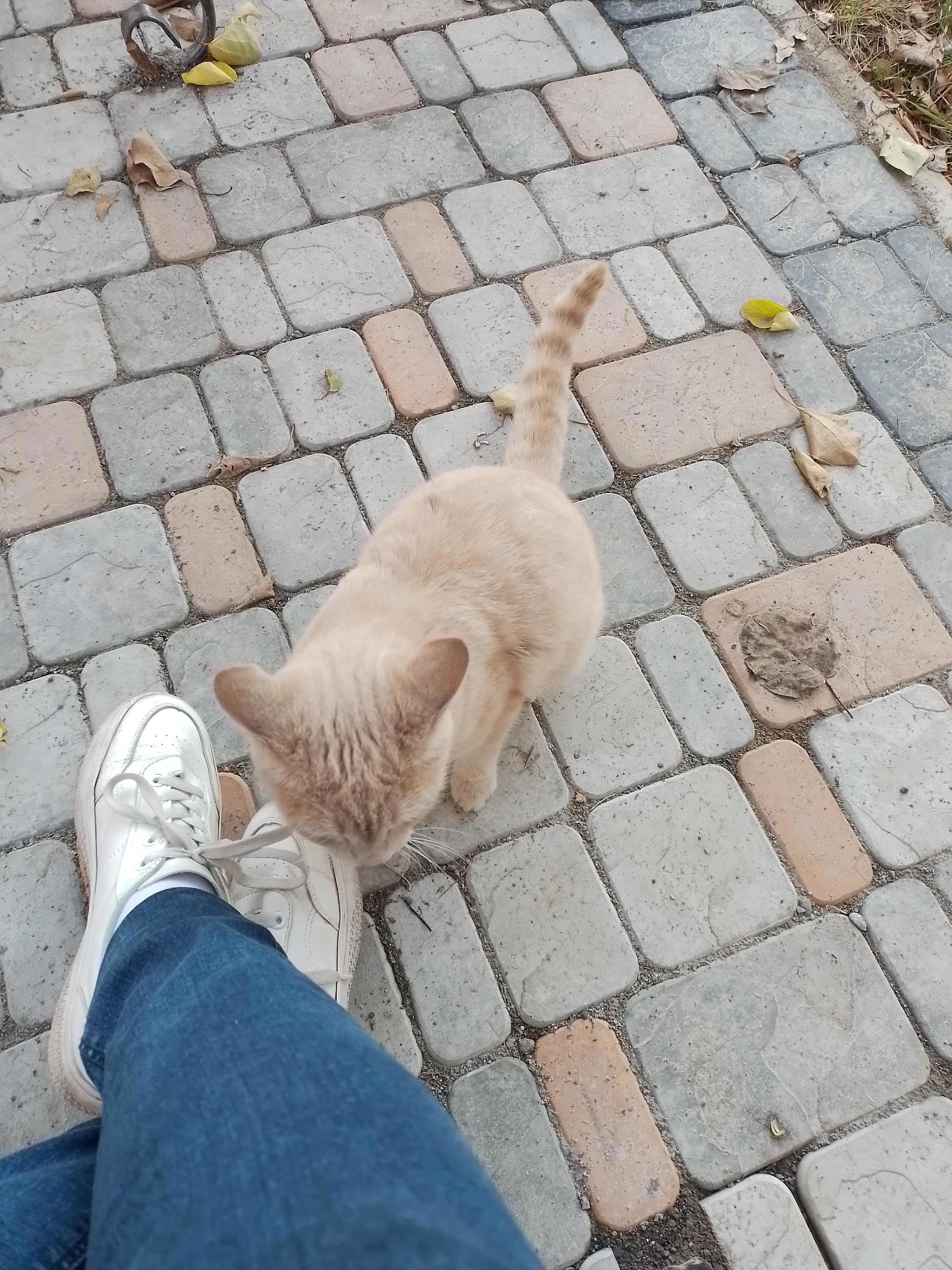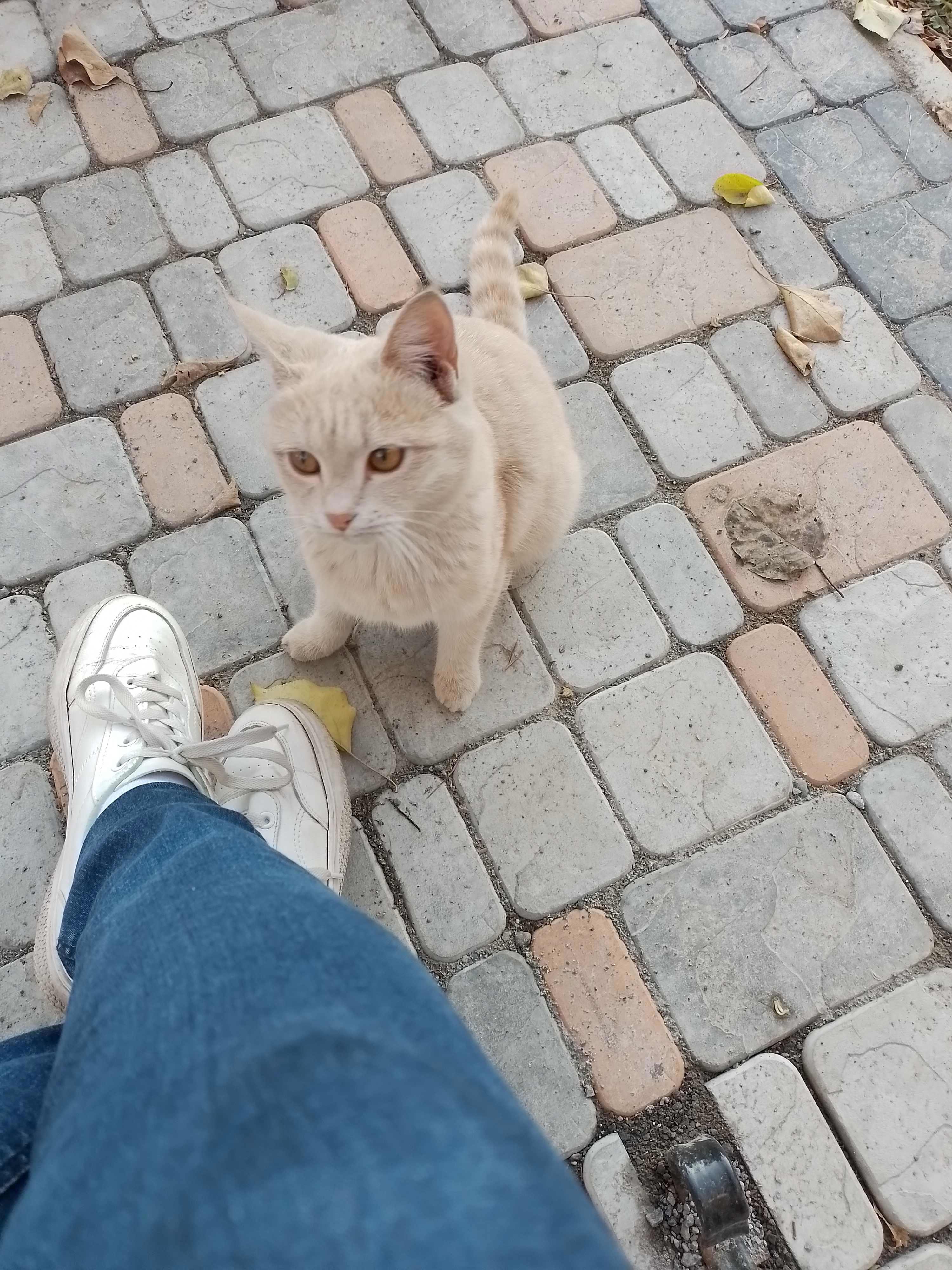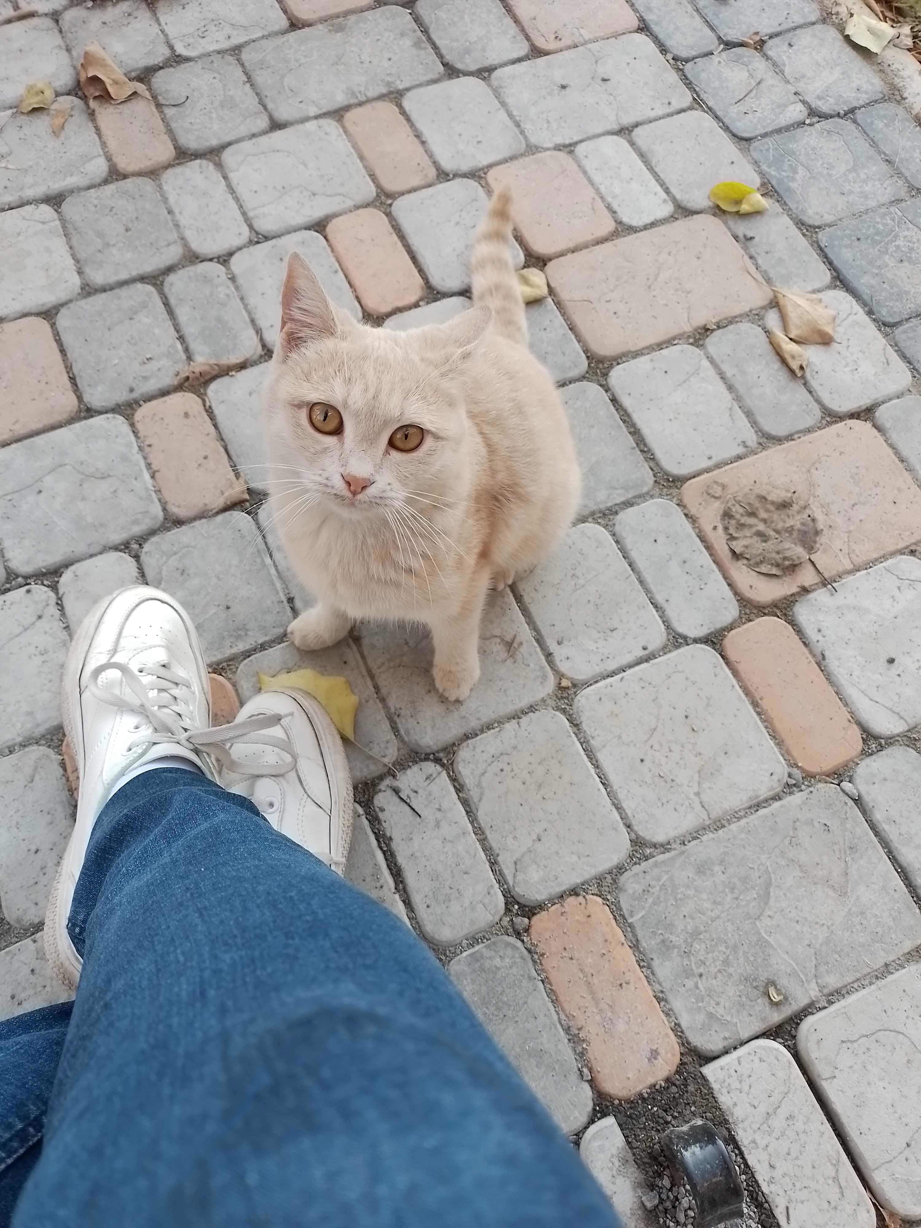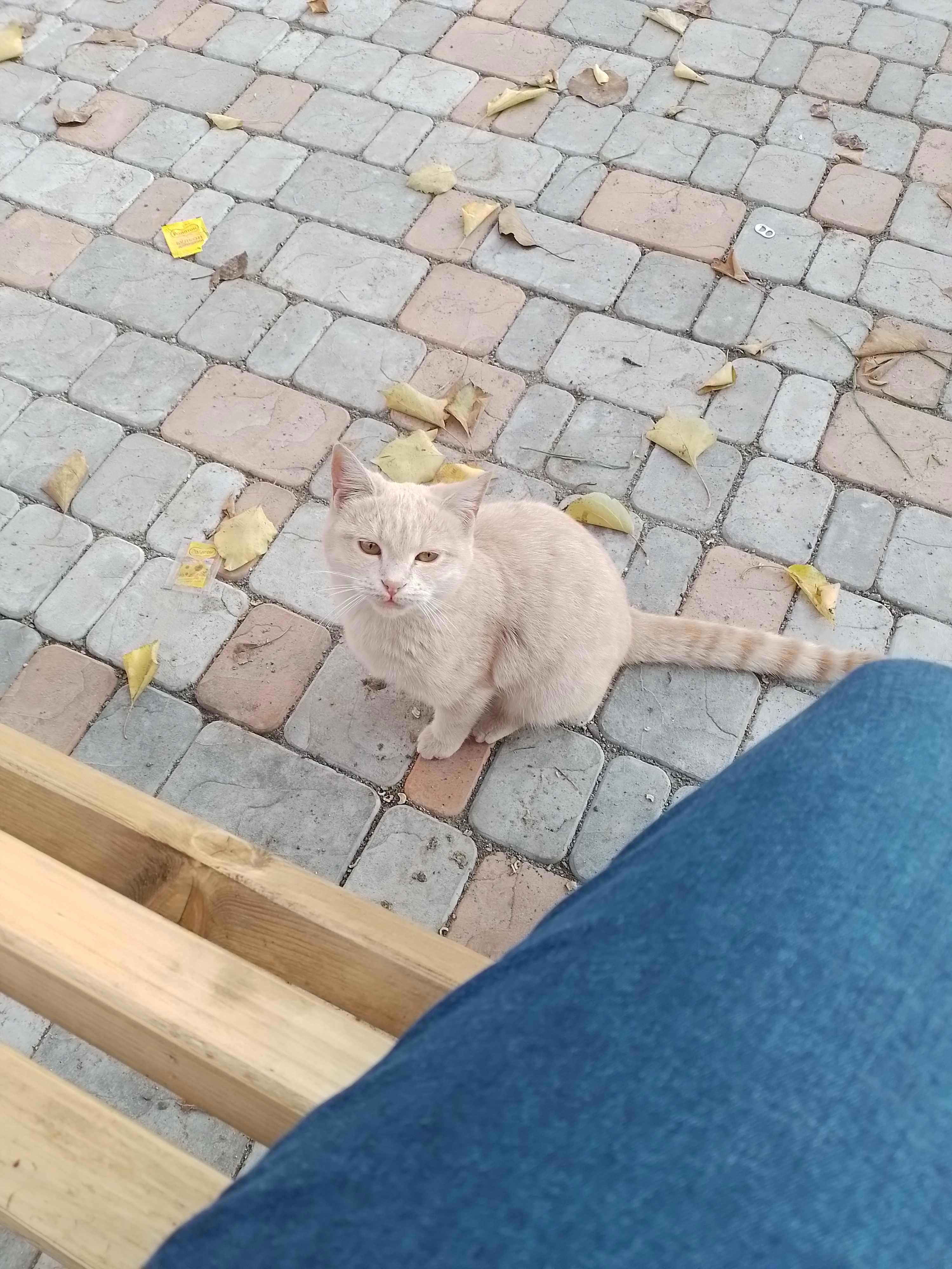 Это наш дворовый Персик, а коротко Перс. Он очень славный и почти ручной. Прыгает на колени и даёт себя погладить.