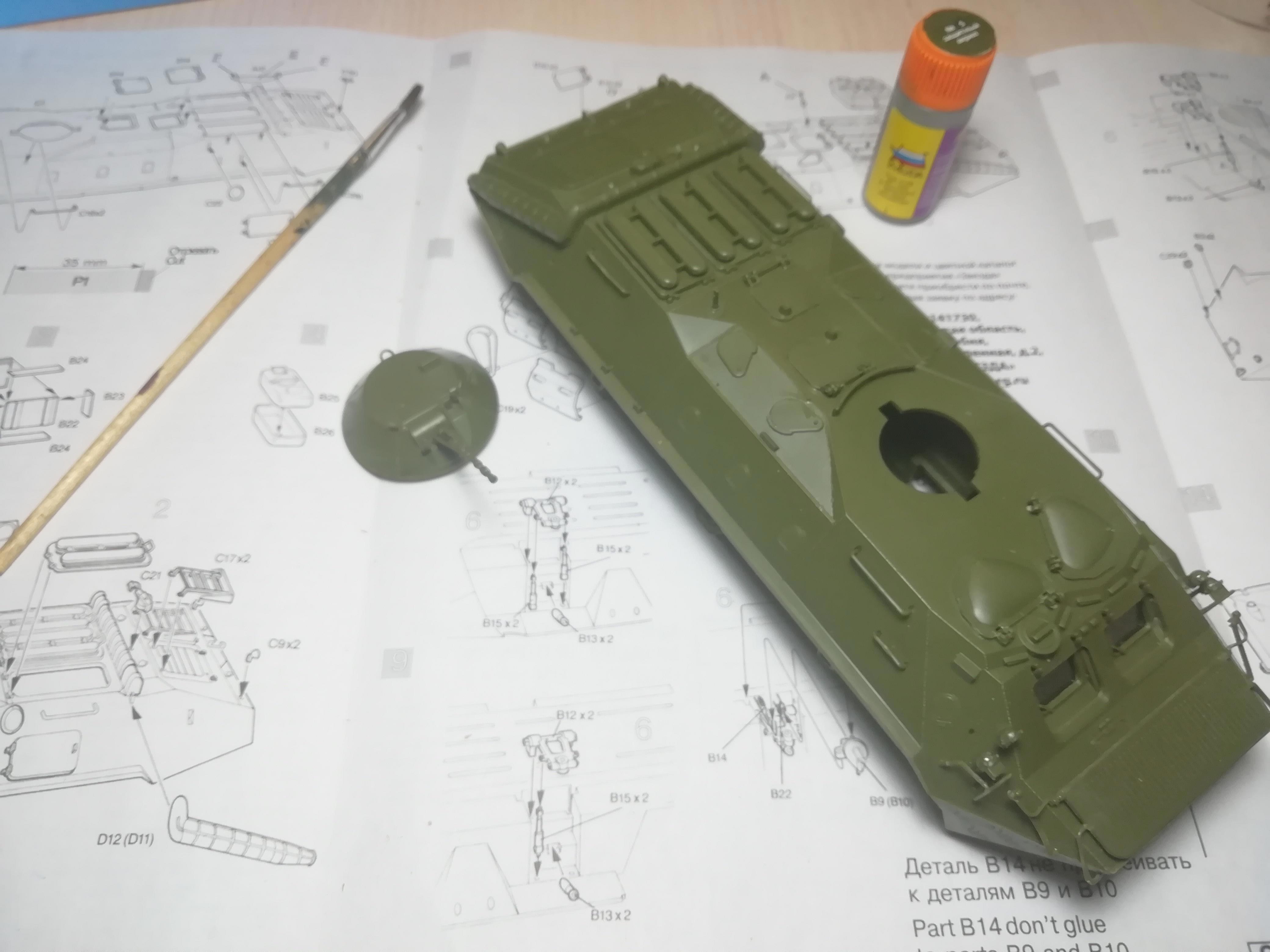 3. Я, помнится, говорил, что БТР попроще УАЗика? Ну-ну... Все маты сложил, пока красил - и это только первый слой, а их будет минимум три! А потом нанесение потёртостей, ржавчины и грязи.