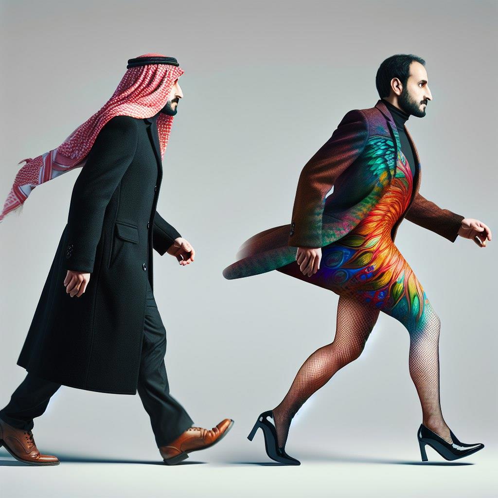 Фактический запрос: A Middle Eastern man wearing a dark coat is metamorphosing into a Caucasian woman in a vibrant, colorful short dress. The figure is moving from the left to the right edge of the image, taking a substantial stride. The leg on the back side is masculine, belonging to the man, while the front leg is feminine, transitioning to the woman. The transformation is fluid, creating an abrupt contrast between the two identities, yet somehow seamlessly blending them together in the iteration of a single step.