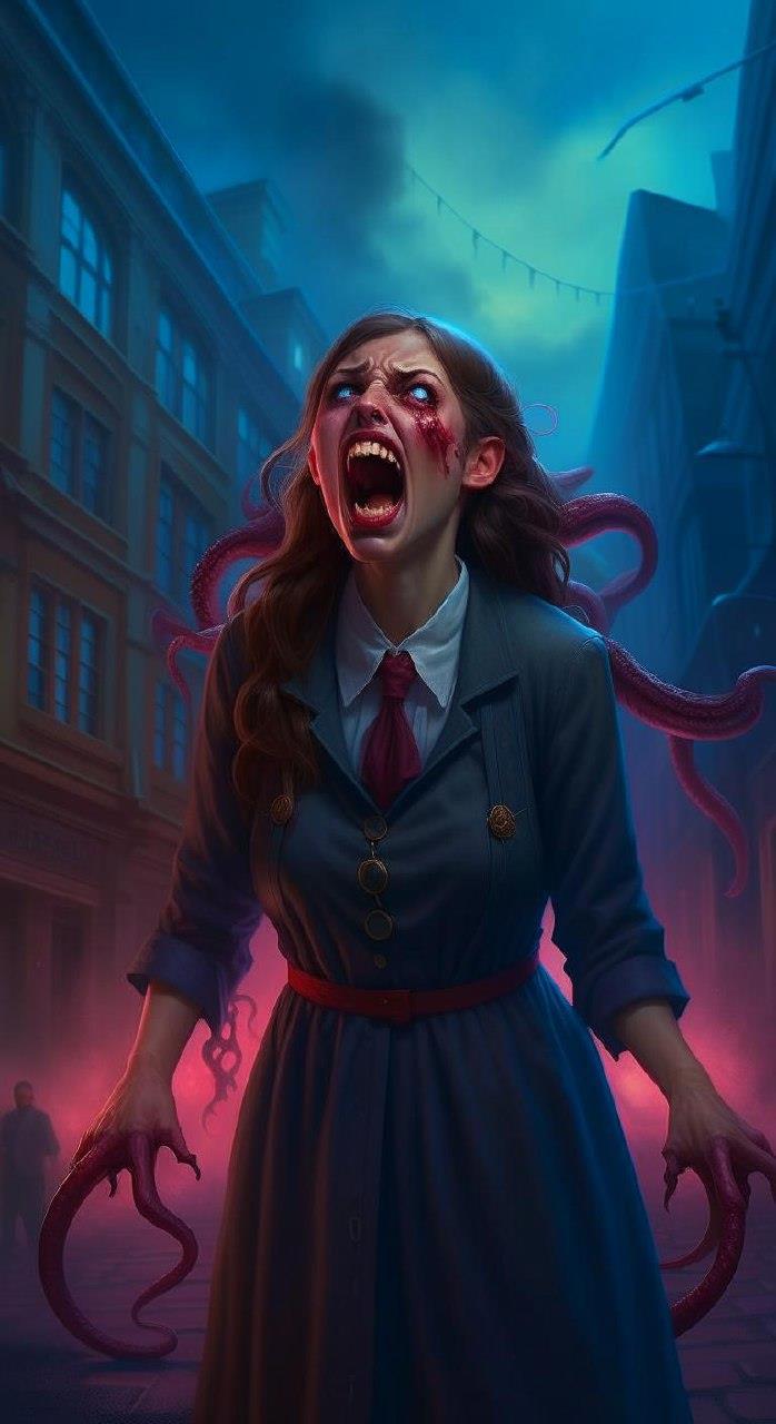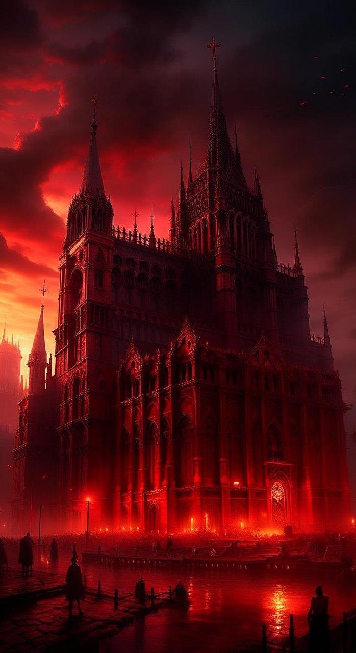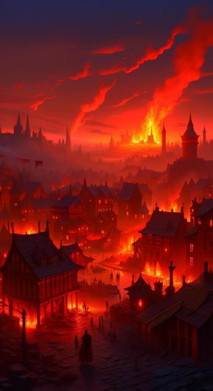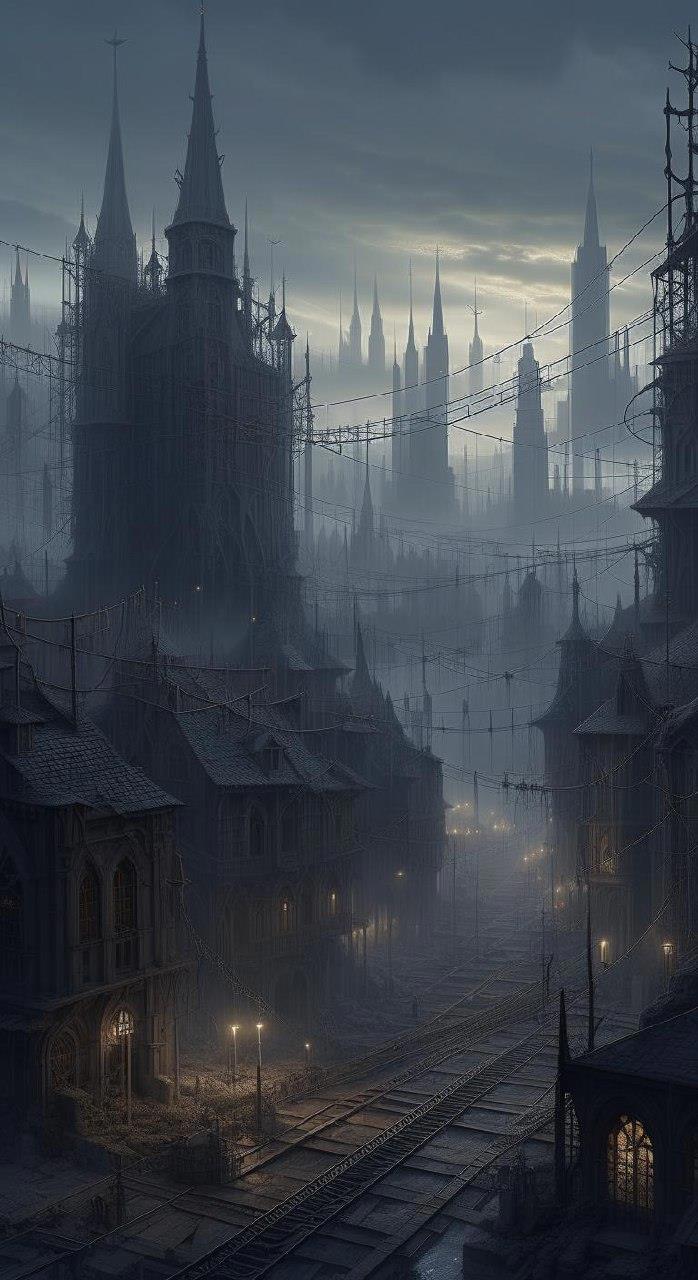 Увы, нейросеть не умеет в паутину из проводов над городом, но и так, полагаю, вышло весьма атмосферно. Мне нравится. Вот еще парочка, в инфернальном антураже:
