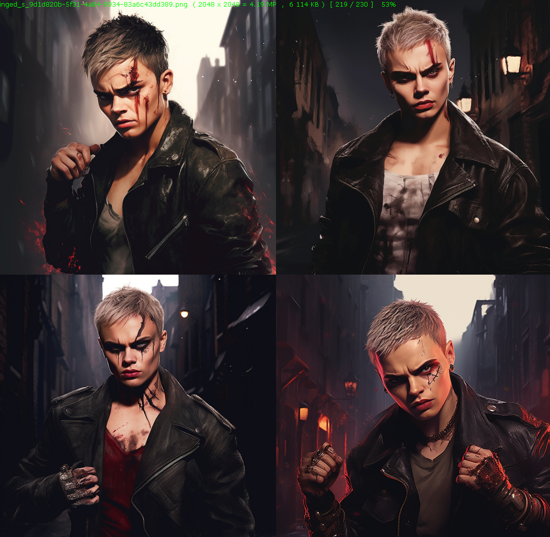 Увы, больше всего не повезло Барби - Барбароссе. Или повезло. Тут как посмотреть. Дело в том, что нейросеть наотрез отказывается изображать любые жуткие или обезображивающие детали человеческого лица. Одинокий прыщик - можно. Кокетливая ссадина на скуле - ну ок. Но исполосованное шрамами лицо, как у Барби, уже никак. Можете даже не пытаться, я пытался три дня. Смешивание, проектирование стилей, прочие ухищрения...