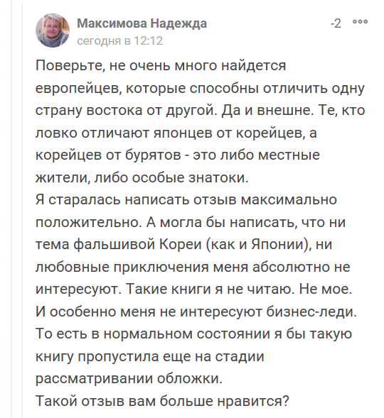 Судить о книге не читая ее. Называть Корею - Японией. Поучать на тему того в чем не разбираешься совершенно, что госпожа Максимова признает в последующем комментарии.
