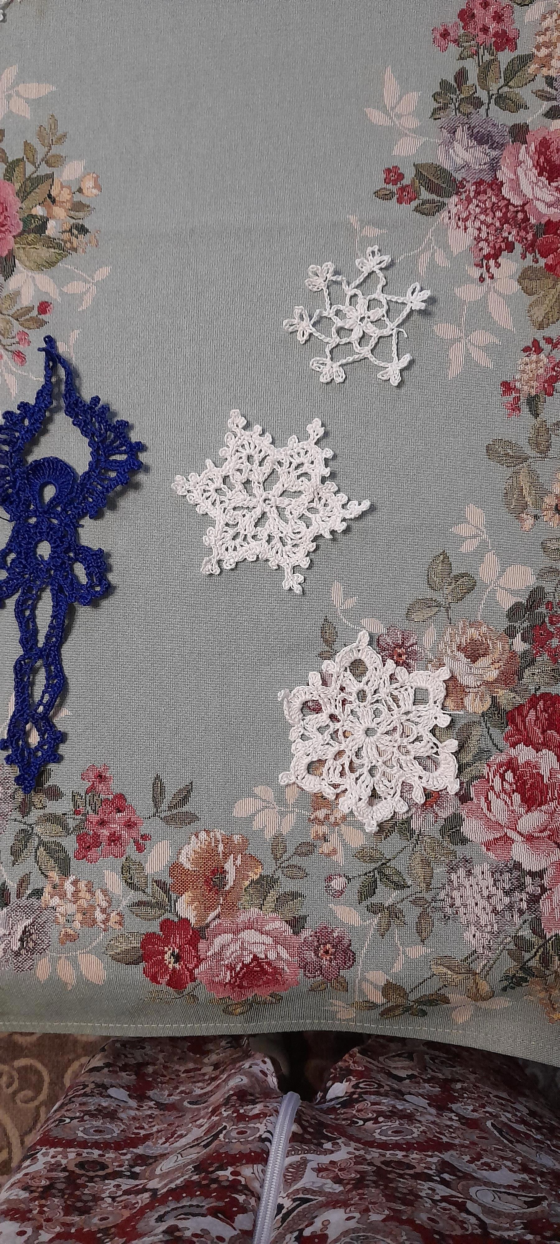 А еще вчера начала вязать колокольчик на елку, но белые нитки, что у меня остались несколько толстоваты для этого, и, вместо колокольчика на елку стало получатся такое солидное, новогоднее болтало для гламурной коровы. Поэтому, пока вязанного колокольчика нет, зато есть еще снежинки.