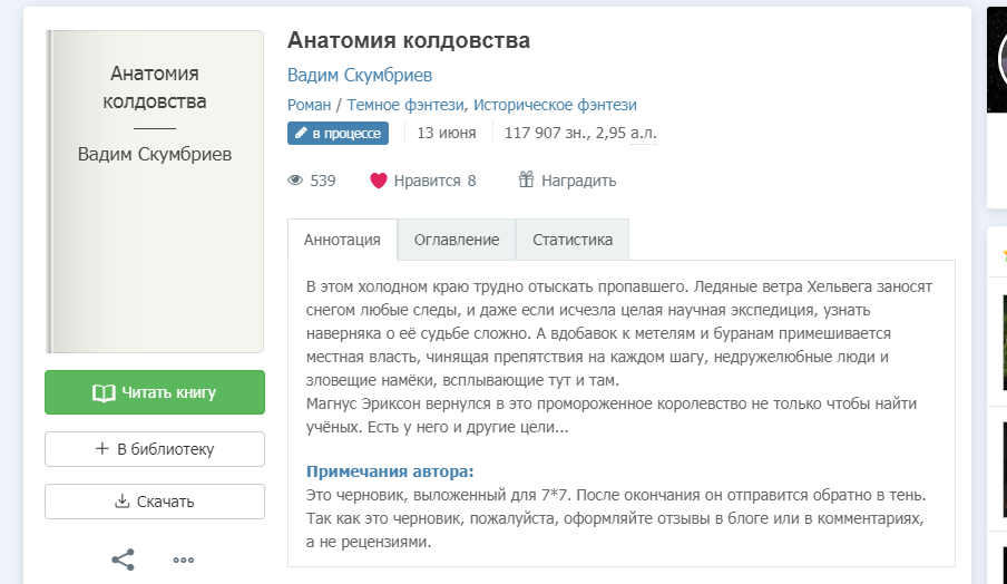 7. Впечатление от текста в целом — В целом пока среднее фэнтези, 7 балов, если Вадим обработает его и усилит я его прочитаю. Без обработки и усиления эмоциональной части я читать не буду.