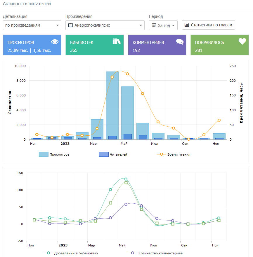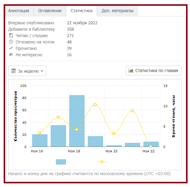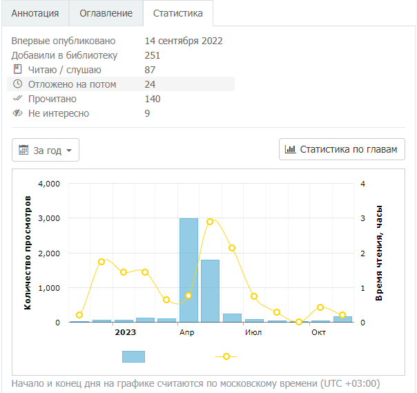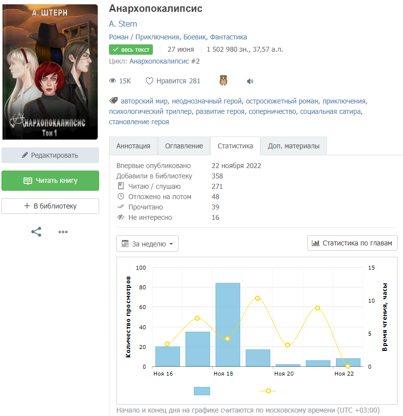 За первый год роман собрал 15 221 просмотров и 358 библиотек. Не густо, но вполне релевантно. С учетом самого большого показателя времени чтения 222.41 в мес.