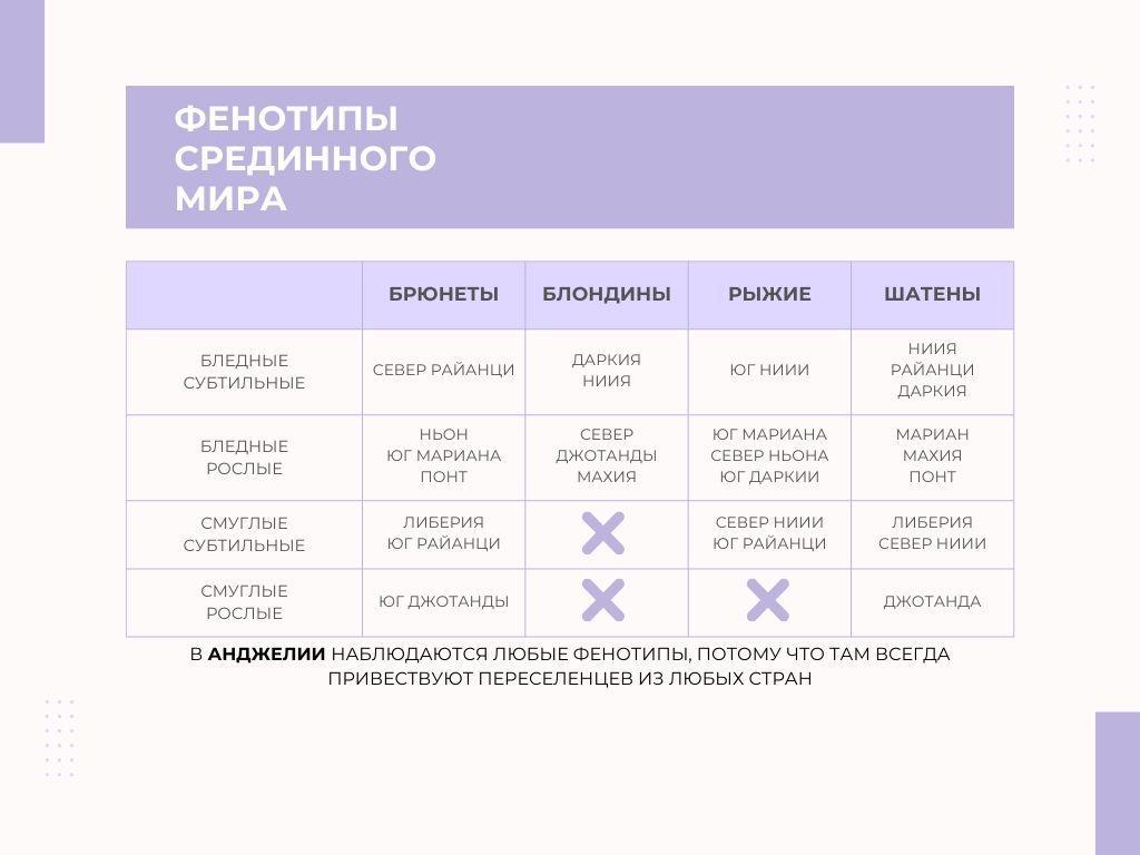 Или вот, недавно в ТТ интересовались по поводу фенотипов моих народов, и вот какую табличку я сделала: