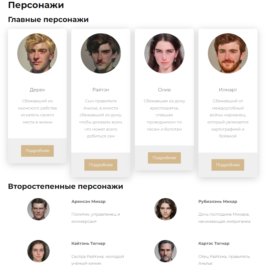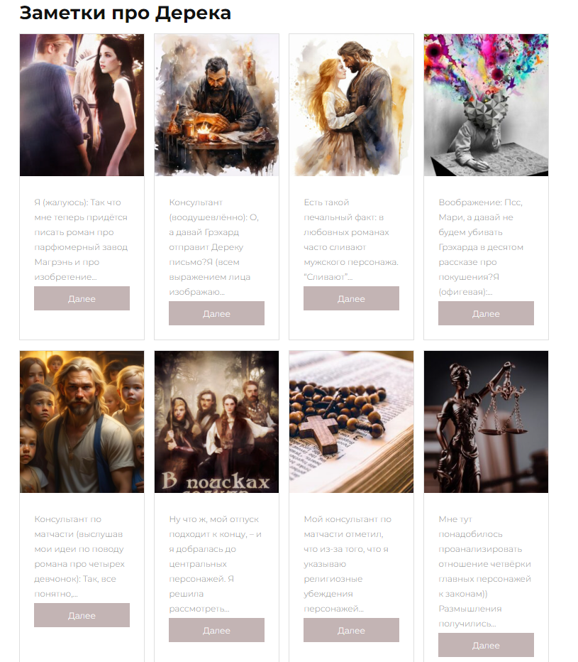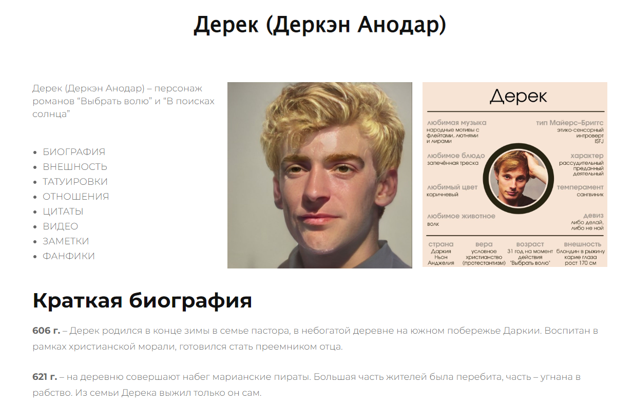 Формат "энциклопедия на сайте" оказался идеален, потому что позволил удобно организовать все материалы: и проработку персонажа и его биографии, и визуальные материалы, и цитаты из книги, и видео (а я часто снимаю вертикальные видео о своих книгах), и текстовые заметки (а я часто пишу посты в вк с размышлениями), и даже фан-материалы (когда таковые присутствуют).