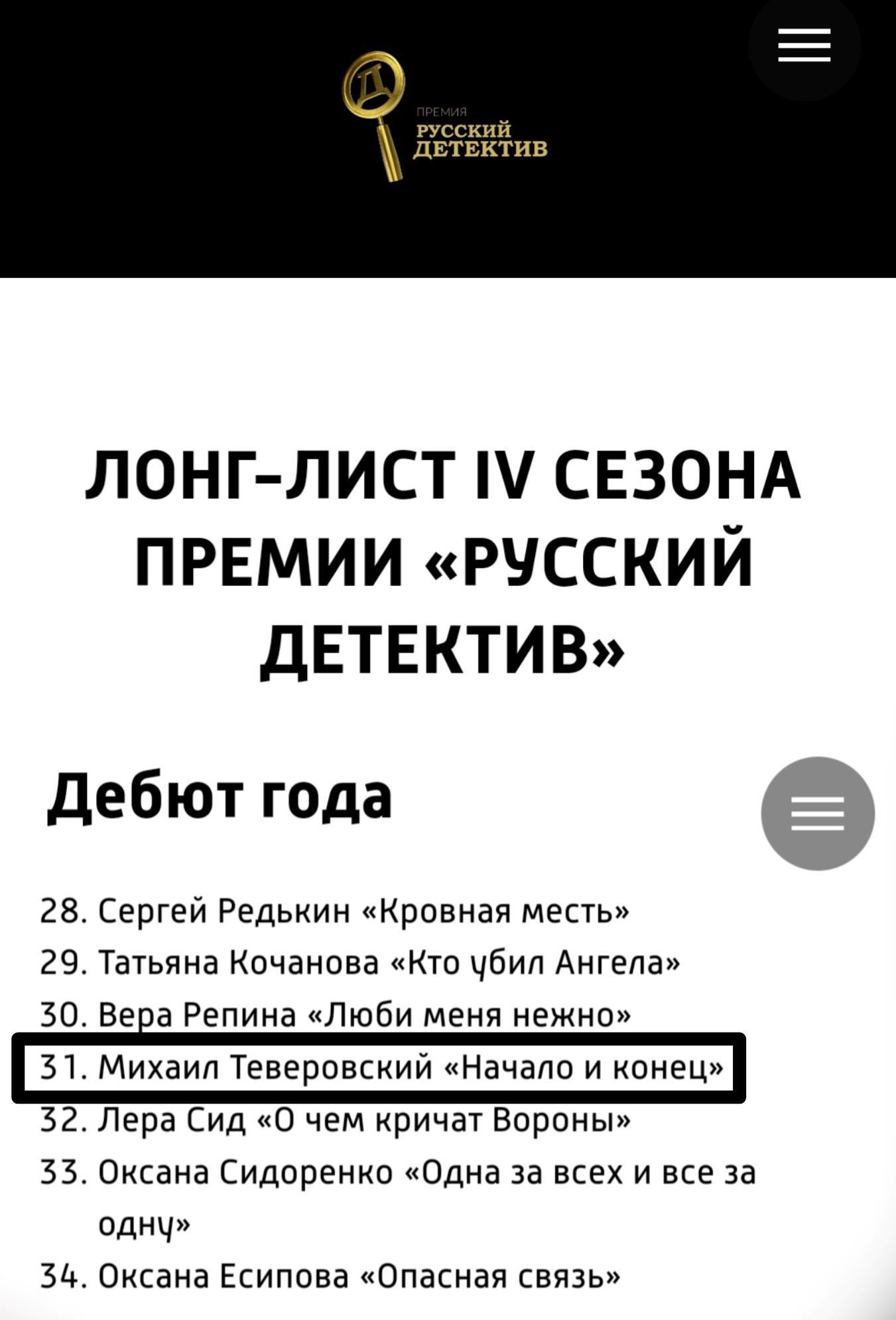 Мой триллер "Начало и конец" вошел в лонг-лист премии "Русский детектив" IV сезона в номинации "Дебют года".