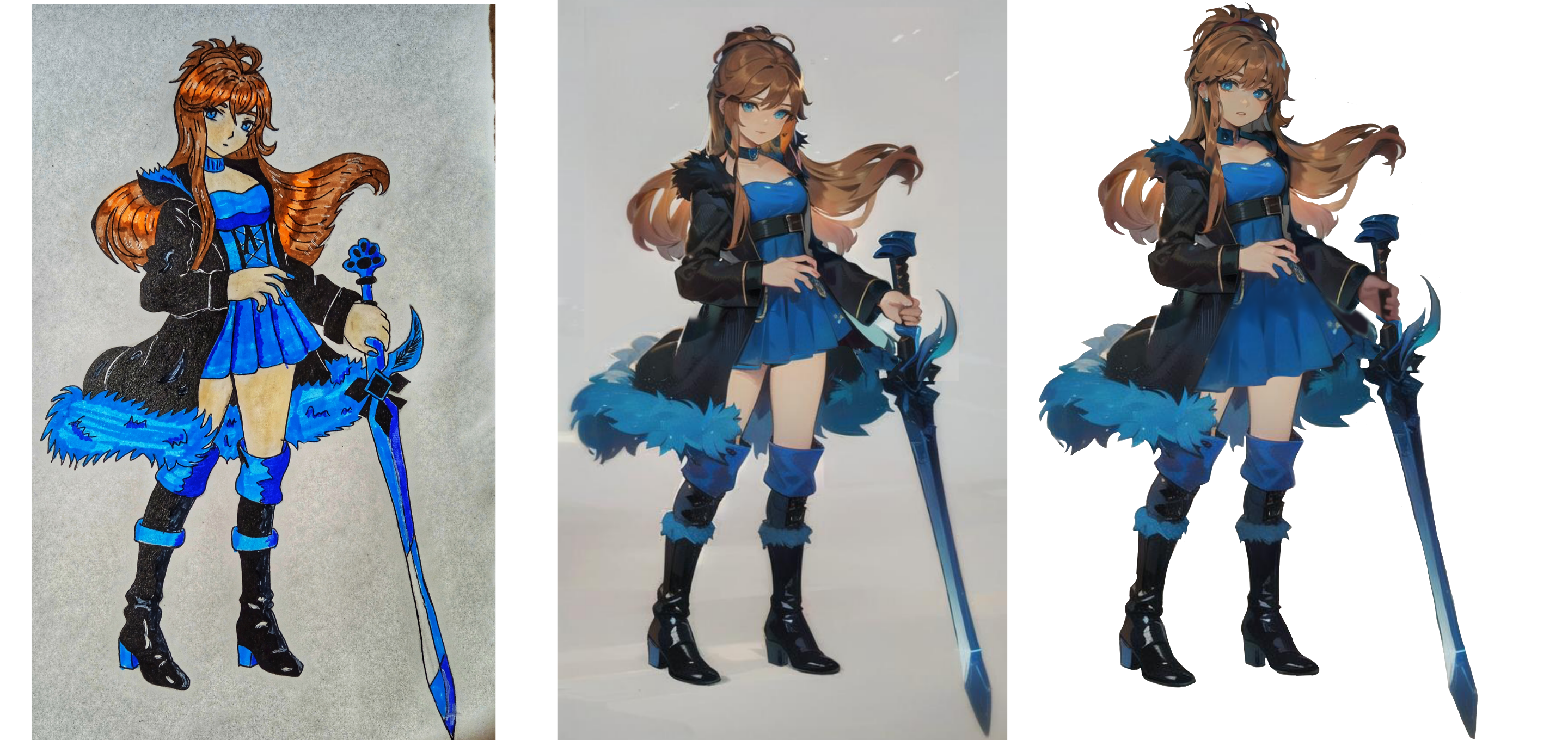 На наброске есть проблема с анатомией и меч кривой. После обработки анатомия поправилась, но вот с рисованием рук у AI, такие же трудности как и у ленивой меня. Плюс наконец заметила, что с длиной юбки перестаралась и сделала ее не практичной. Поэтому помимо рук дорисовала и длину, теперь наслаждаюсь результатом.