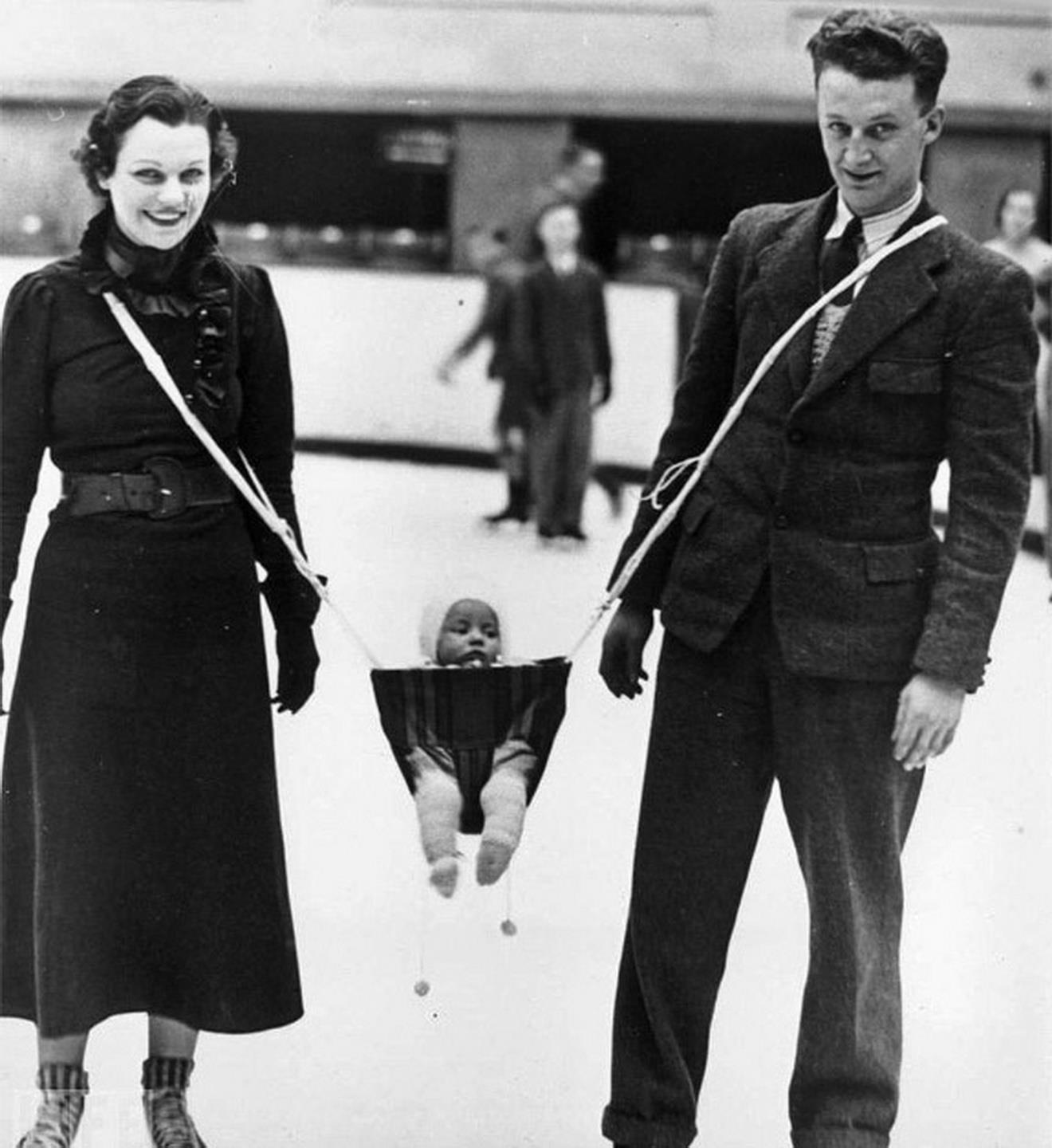 Детская переноска для двоих. 1936 год Это изобретение никогда не было в массовом производстве (ух!), но я назвал бы его Рогаткой для отправки ребёнка в реанимацию. Парочка о всему на коньках! А вы видели, как влетают в борт хоккеисты?)