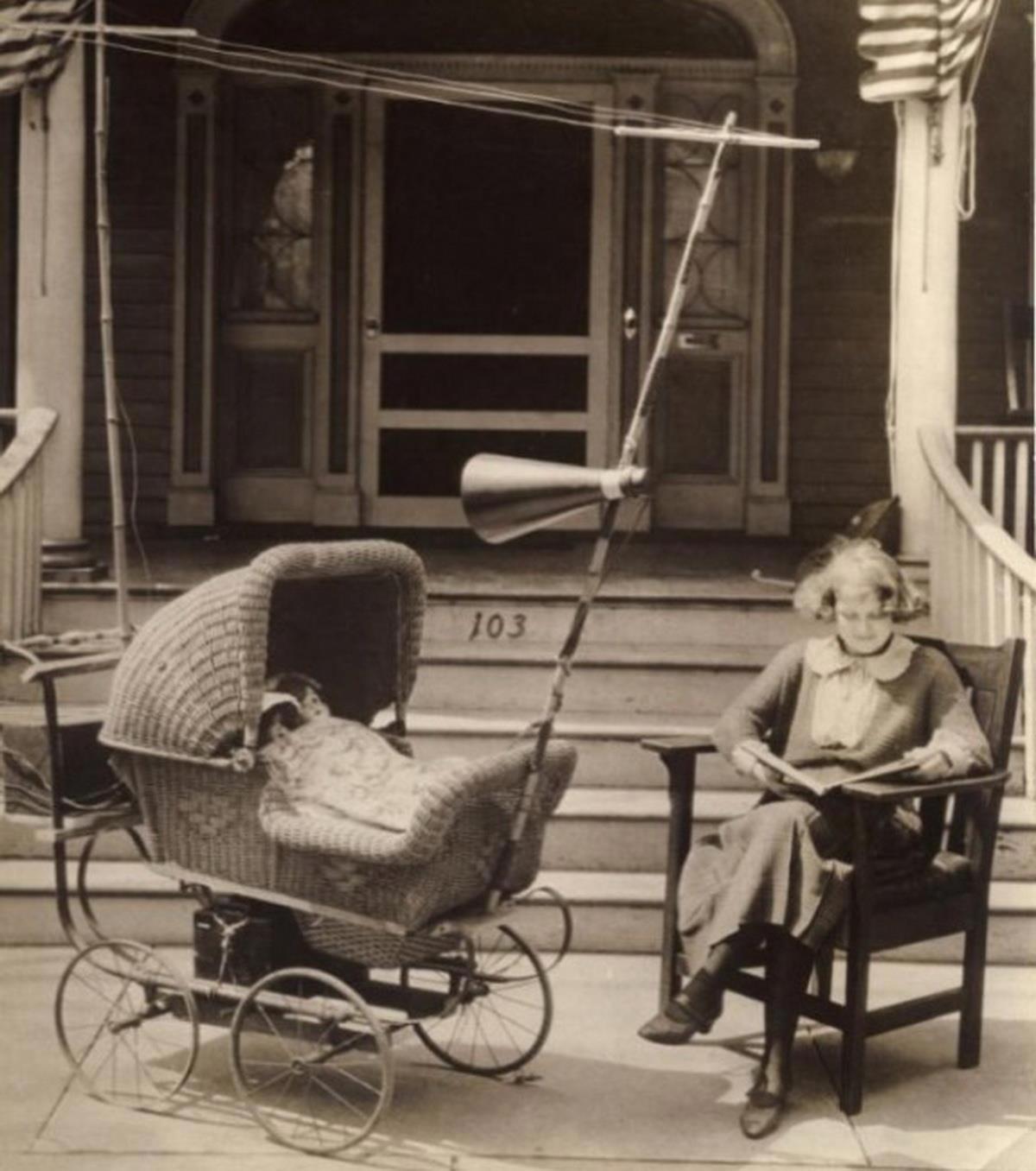 Коляска с переносным радиоприёмником. 1920-е годы. Как вокруг коляски не догадались провод обмотать?)