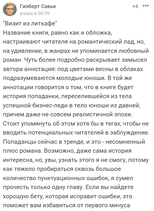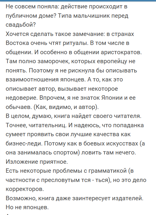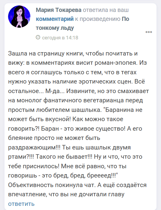 Главу и даже пролог я прочла, поэтому мой разбор более чем объективен и конкретен. Но если кому- то нравится читать сии "произведения" то это уже дело вкуса, а мне же мое эстетическое чувство прекрасного не позволяет "наслаждаться" подобным. Как и "играть в поддавки" возводя чужую некомпетентность в ранг критики. К слову я обожаю мясо и терпеть не могу вялую, тухлую зелень. Ее как и мясо следует уметь готовить, как и правильно цитируя одного Кэпа "жечь текстами". В том числе - критикой. Предвзятое, завистливое мнение "маленьких людей" по Чехову, получивших эфемерный признак некоей "власти", не может являться таковой.