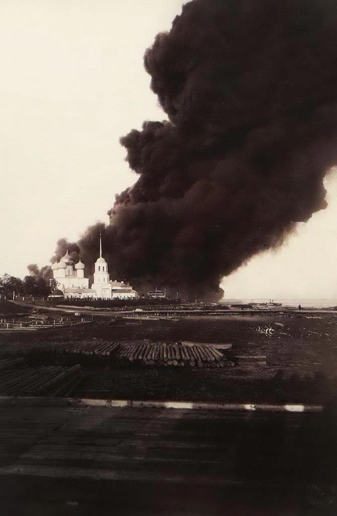 А вот смотрите какой потрясающий кадр. Снято еще до всяких наших драматических событий, в 1909. Пожар на складе смолы, этот район назывался Смоляной Буян