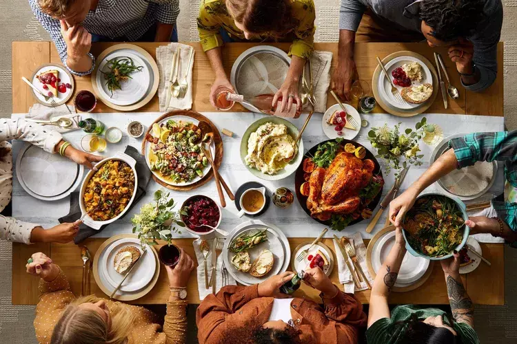 День Благодарения - это семейный праздник, который всегда отмечается большим застольем, самым крупным в году. Традиционно готовят индейку, обычно фаршированную смесью, сделанной из кусочков хлеба смешанных с овощами и специями, называемой "stuffing" ("начинка"), подают с клюквенным соусом или подливой (gravy). Другими традиционными блюдами для этого застолья считаю картофельное пюре, тыквенный пирог, блюда из кукурузы и бобовых.