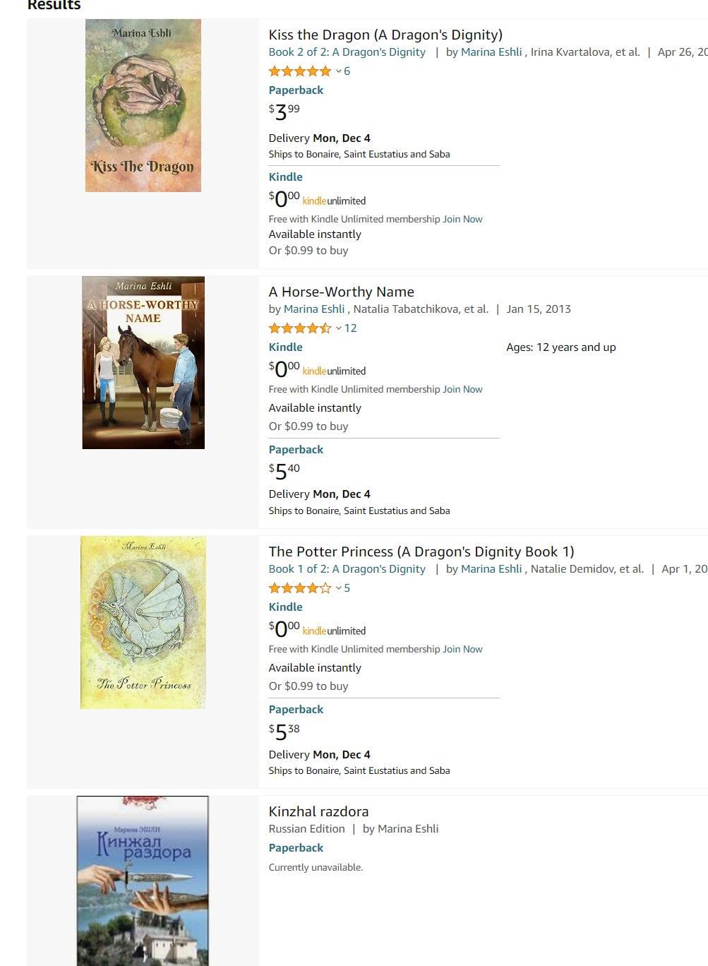 Решила найти картинку. Вспомнила, как бодалась с амазоном, чтобы они признали бумажную книгу "Кинжал раздора" тоже моего авторства. Дело в том, что русские издатели раньше за дорого выставляли изданную бумагу (интересно, покупал кто из эмигрантов за дорого с амазона, если можно было было заказать через другие онлайн магазины в разы дешевле, наверное нет, это просто дело престижа - мы выставили автора на амазоне). Так вот ленивый продавец "Кинжала" вбил имя только как M. Eshli. И амазон говорил, что не добавит эту книгу к моему авторству, пока не исправит продавец имя. Я писала, что фиг достучишься, но вот вам доказательства. Плюнула. А вот поди ты, амазон исправил, когда уже поздно и пофиг.