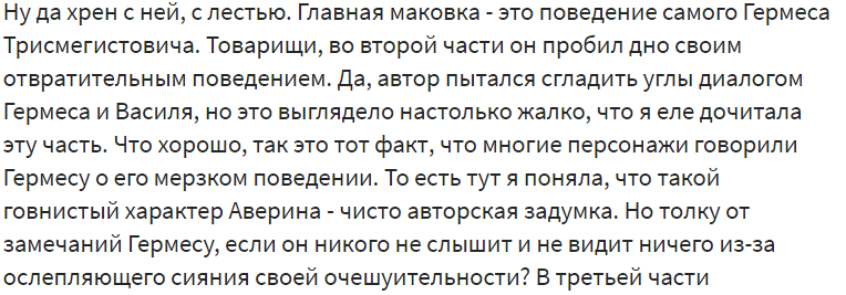 Мораль? Да та же, что и обычно. Критики идут лесом, потому что читают они не книжку, чаще всего, а то, что им диктуют голоса в голове. По крайней мере я пока не видел ни одного критического замечания, которое не выглядело бы ну просто откровенно нелепо.