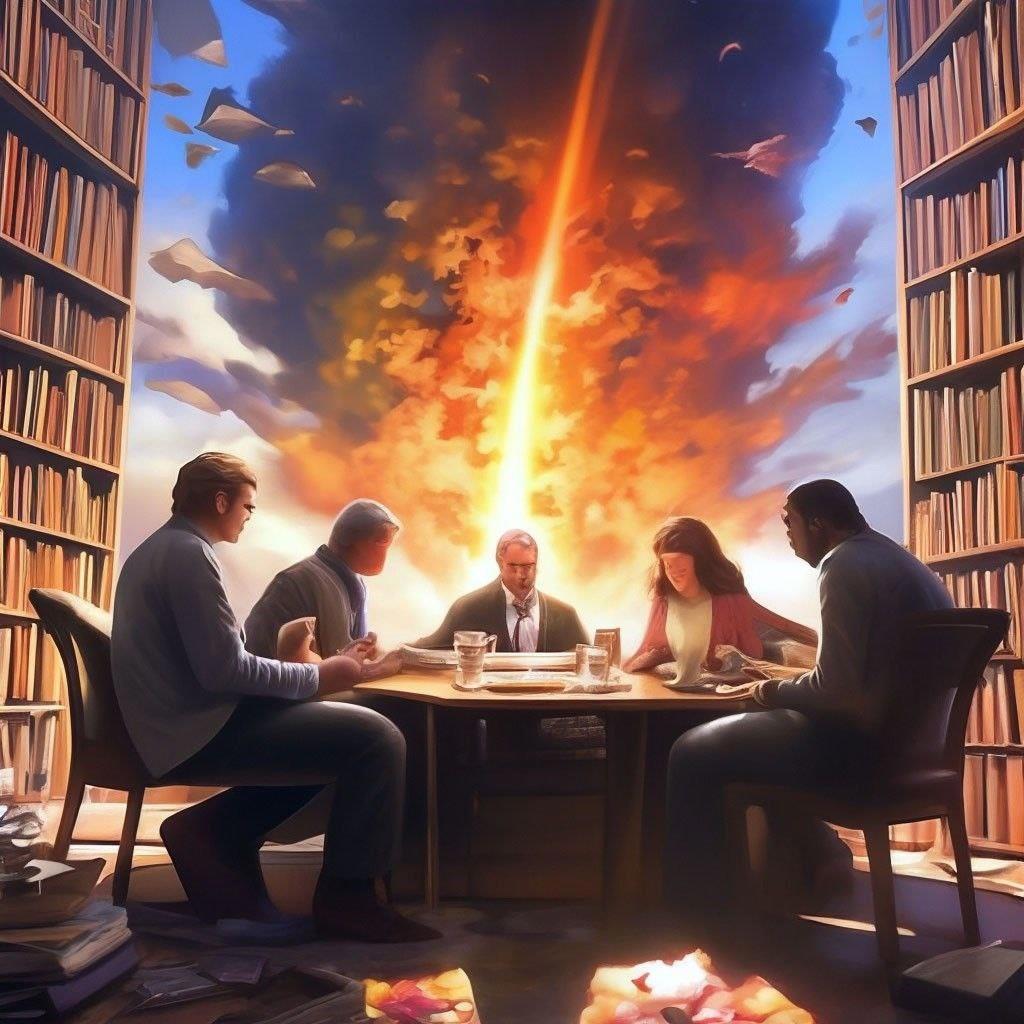 Так "Шедеврум" видит запрос "Писатели огненно разбирают книги друг друга". Примерно так и было :)
