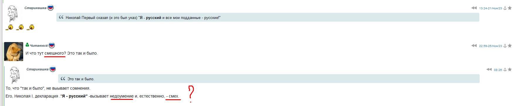 На скриншоте показано, что у пользователя с ником старикашка данная фраза Николая 1 вызвала недоумение, а вследствие чего смех. Более того он считает что такая последовательность эмоций это нормальная реакция.