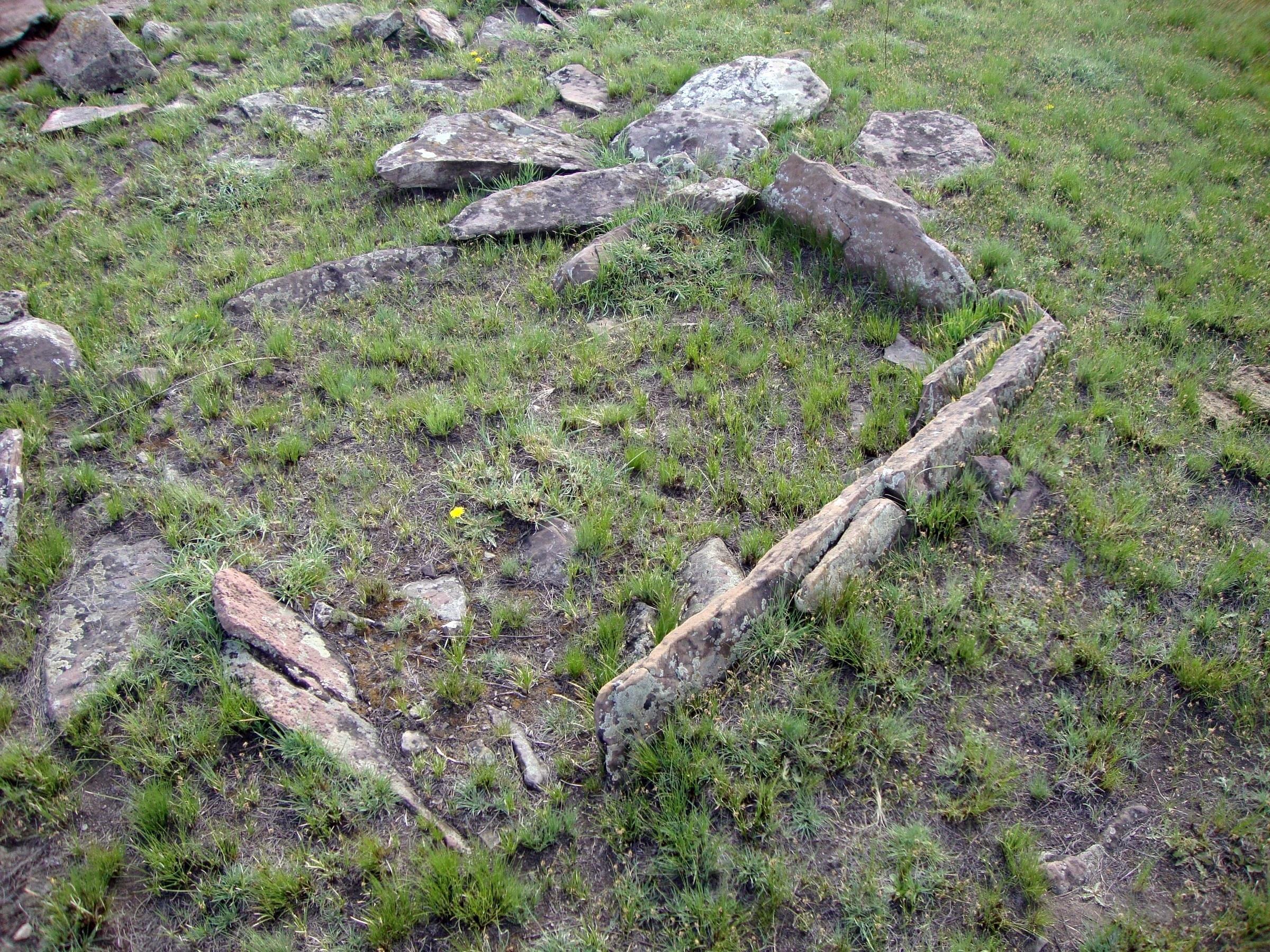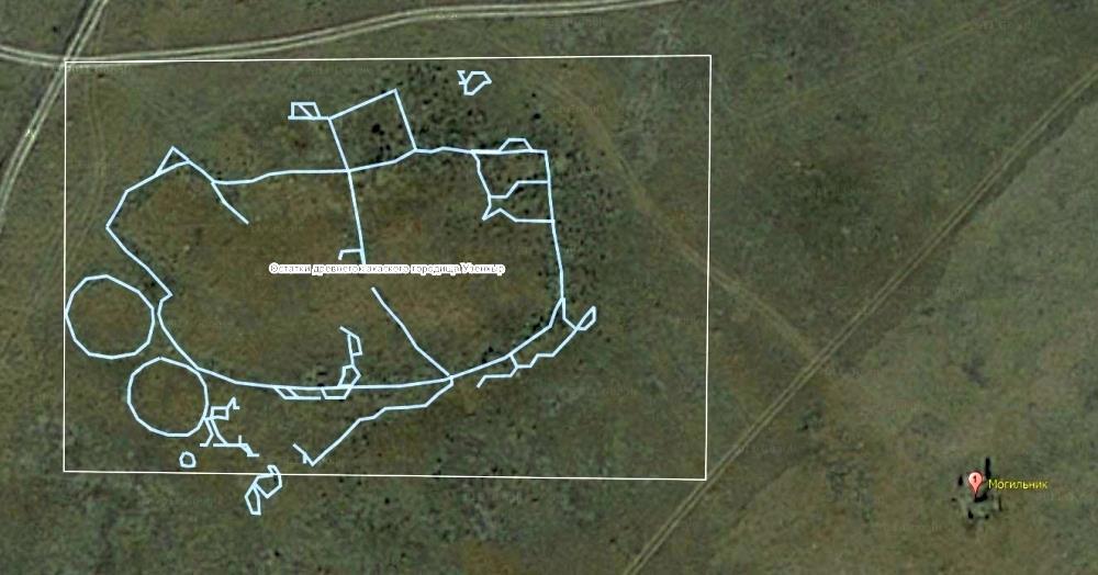 На мой взгляд эти нагромождения камней с Аркаимом и рядом не сидели. Вообще непонятно, на каком основании их упоминают вместе. Никакой внятной системы здесь и близко не просматривается. Ориентации по сторонам света не то чтобы не наблюдается, её вообще в принципе быть не может – всё слишком кривое. Какие, к шутам, «сторожевые башни»? Это вот те два круга с торца контура, отдалённо напоминающего прямоугольник? По мне так это больше напоминает двойной объект, принятый на схемах отмечать буквами «Мэ и Жо». Может, если посмотреть поближе, то станет понятнее? Посмотрим: