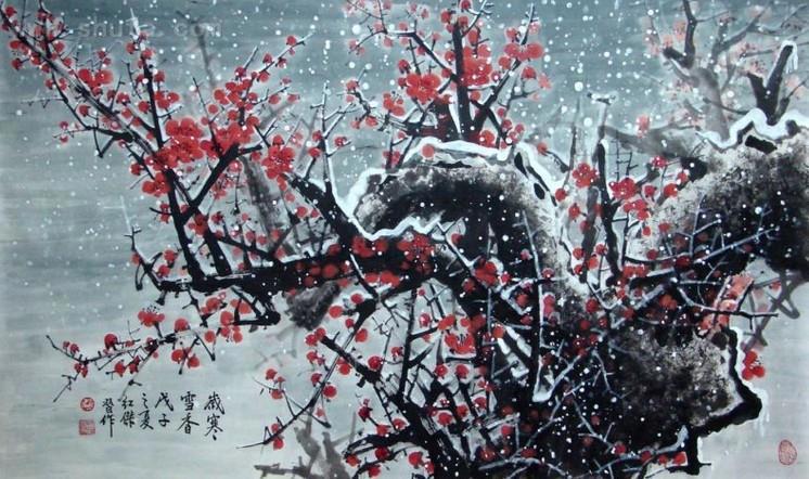 На картине слива мэй под снегом. Для зимнего настроения.