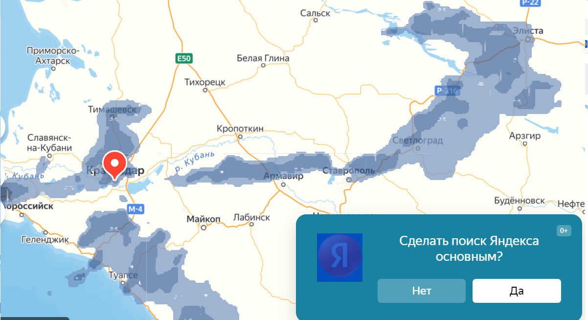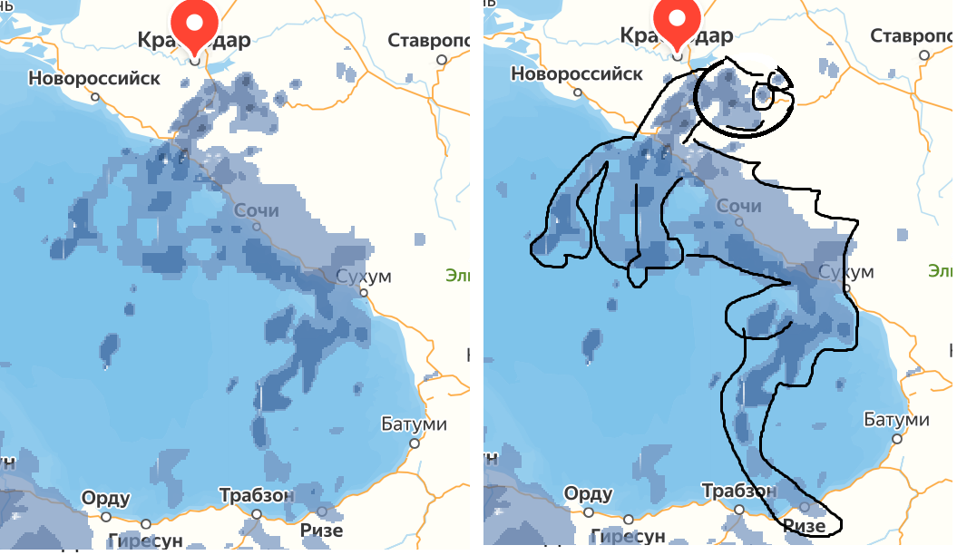 Здесь целый зоопарк: В Краснодаре "Белочка", перед ней притаилась "Крыска" (прижала ушки) а дальше "Кошка", которая разворачивается в сторону Крыски. А в районе Туапсе "Крокодил" пытается войти в мре.