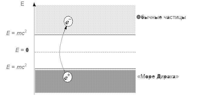 Таким образом, в наблюдаемой Вселенной возникает электрон-позитронная пара, которая по теории моря Дирака является выбитой из моря частицей и дыркой от этой частицы с противоположным значением. Логично при этом, что если электрон контактирует с позитроном (то есть падает обратно в море на не занятую дырку), то он испускает энергию и "тонет в море". А нам со стороны кажется, что пара аннигилировала, то есть просто исчезла с глаз.