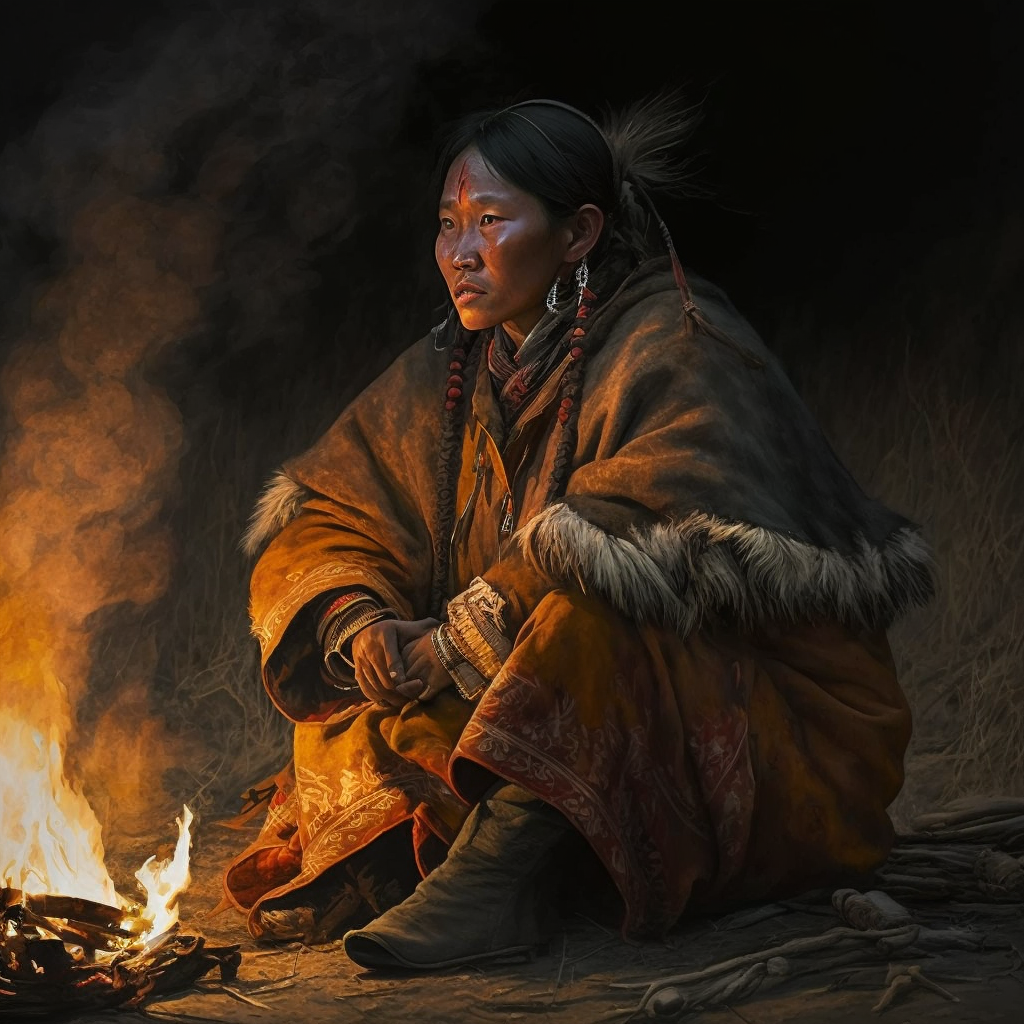 Пламя высвечивает широкое плоское лицо. Непривычно-чужое. Человеческое ли?! Коричневато-жёлтое, лоснящееся. Глаза — таких у людей не бывает. Узкие, вытянутые к вискам. Две черные косы, как змеи. Амулеты на шее, на змеях-косах.